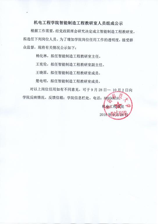米乐mile官方网站智能制造工程教研室人员组成公示