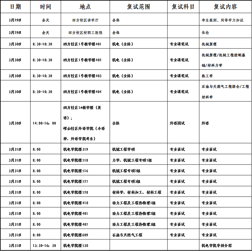 说明: 3月29日报到时,请在报到处--米乐mile官方网站举牌位置填写报到登记详情表;3月30日专业课考试科目《机械原理》的考生请自带绘图工具;3月31日专业面试分组名单详见当天米乐mile官方网站楼一楼张贴,各复试专业按照公布名单的顺序依次进行,政审表在面试时请交于各组政审老师;529房间为考生面试候场处。
