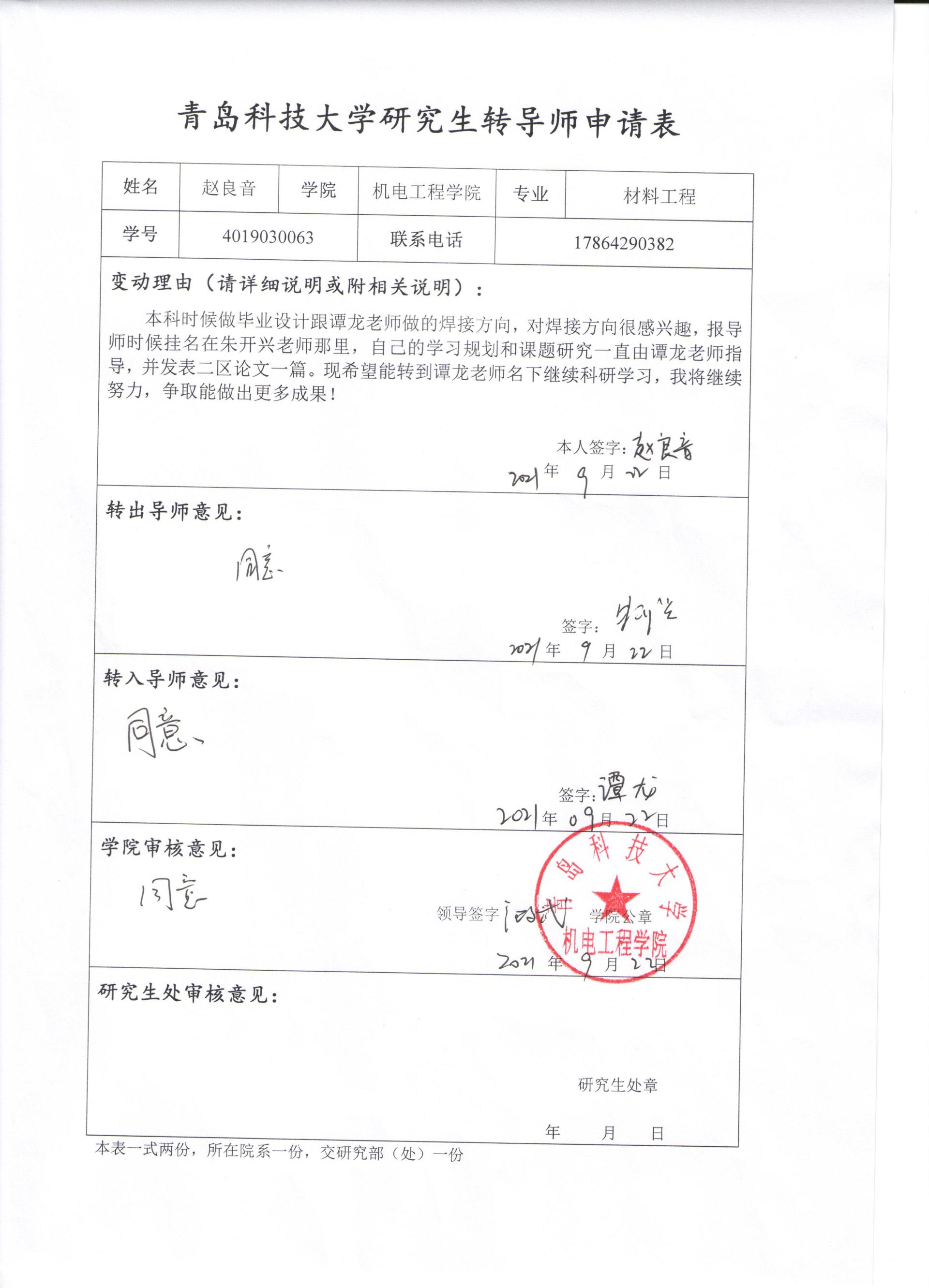 青岛科技大学研究生转导师申请公示