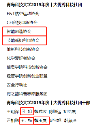6月2日,青岛科技大学2019年度十大优秀科技社团和优秀科技社团干部名单公示,米乐mile官方网站指导的社团节能减排科创协会获评“十大优秀科技社团”,刁旭、魏玉展同学获评“十大优秀科技社团干部”,并推荐刁旭同学参评山东省优秀科技社团干部。高密校区机电系智能制造协会、孔尧同时入选。