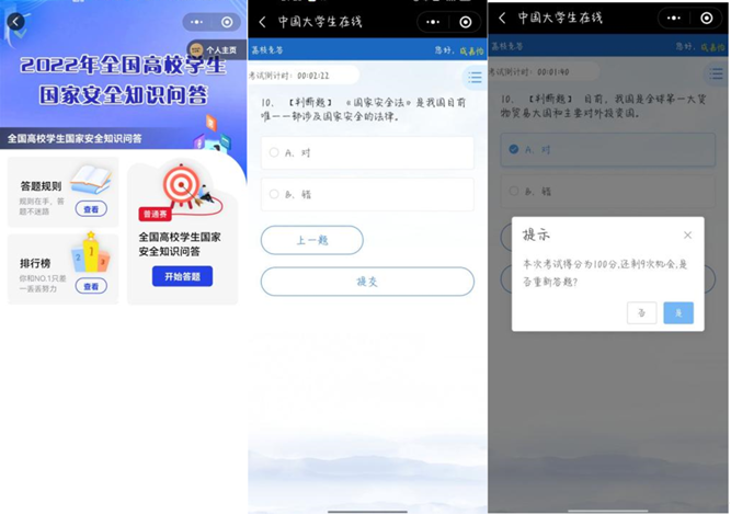 米乐mile官方网站组织同学们参与“全国高校学生国家安全知识问答活动”,全面普及学生安全意识,强化安全教育,大力营造校园安全文化氛围。知识题目涉及国家安全、网络安全、疫情防控、宿舍安全和食品安全等方面,2000余人积极参与知识竞答。此次答题活动具有很强的现实意义,在一定程度上进一步提升学生安全知识储备,提高了同学们学习安全知识的主动性与积极性。要切实增强学生的总体国家安全观和责任感,把校园安全工作抓早抓小、抓实抓细,营造时时讲安全,事事讲安全,人人讲安全,人人抓安全,保证人人安全的良好校园氛围。