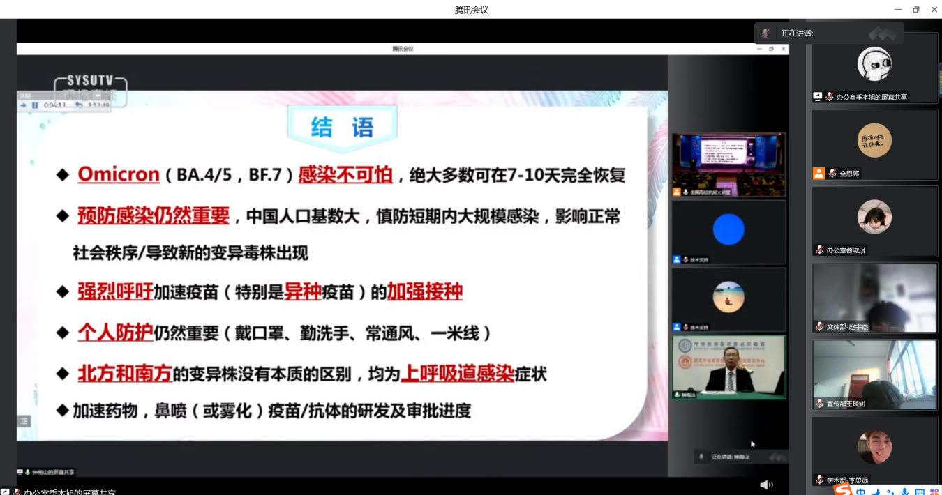 讲座对高校大学生了解Omicron发展态势、纠正一些社会上的误解以及今后如何防控进行清楚的讲解。钟南山院士对三年以来的新冠疫情防控情况进行汇报,指出疫情防控过程中央始终坚持“生命至上”的思想,疫情防控成果显著,得到医学界专家高度认可。钟南山院士并针对Omicron的发展态势及政策应对加以科学分析。