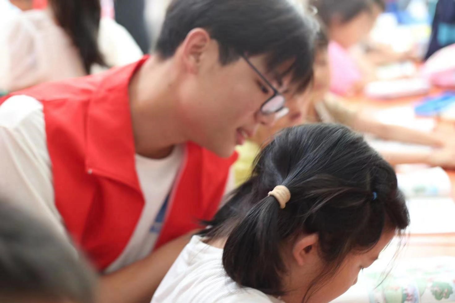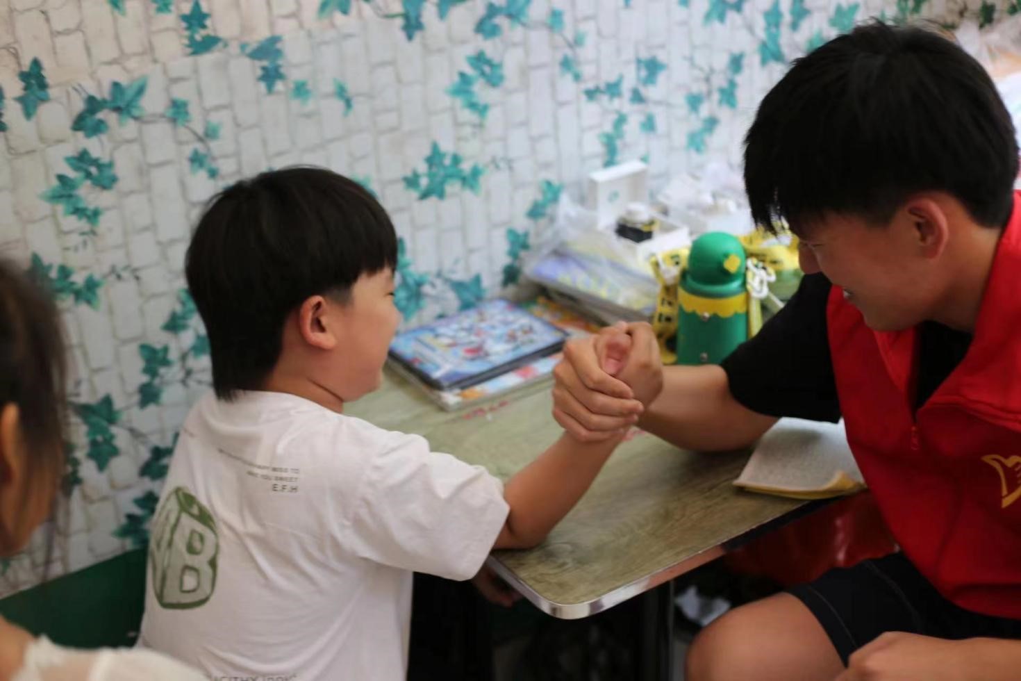 在互动的过程中,团队成员与孩子们建立了深厚的情感纽带。志愿者们与孩子们一起讨论课程内容,解答疑惑,并鼓励他们树立学习的兴趣和自信心。其中一个孩子对数学感到困惑,觉得学习很枯燥乏味,但志愿者们通过趣味的数学游戏和实际例子来解释概念,激发孩子的学习兴趣。在课余时间,志愿者们不仅仅局限于学习辅导,他们还与孩子们展开了各种有趣的游戏活动,其中包括扳手腕比赛。孩子们兴奋地聚集在一起,迫不及待地等待着挑战的开始。比赛开始时,孩子们跃跃欲试,纷纷上场与志愿者们比拼力量,每一场比赛都引起了周围观众的热烈掌声和欢呼声。这种亲切的交流互动让孩子们感受到了来自当地大学生的关爱和温暖,同时也激发了他们对未来的希望和梦想。