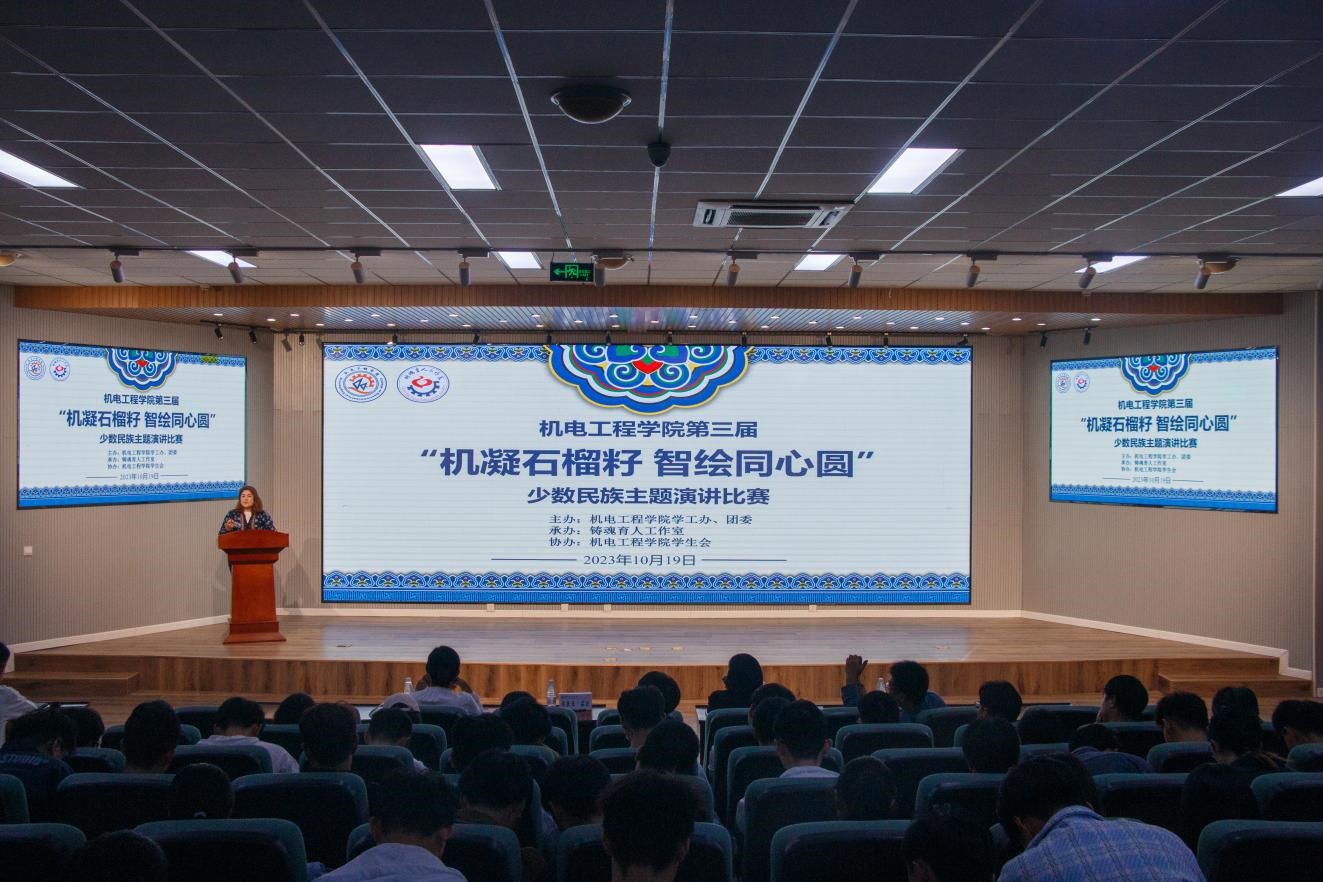 为深入开展学习贯彻习近平新时代中国特色社会主义思想主题教育,进一步加强爱党爱国教育、民族团结进步教育,引导米乐官网各民族青年学生铸牢中华民族共同体意识,10月19日,米乐mile官方网站第三届“机凝石榴籽 智绘同心圆”少数民族主题演讲比赛在米乐mile官方网站530报告厅举行。学院学工办主任王娟娟、少数民族专职辅导员热孜亚·茹孜、新生辅导员、青马学员参加此次活动。