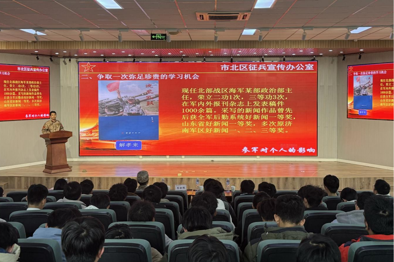 李积伟从参军入伍基本条件、报名程序、大学生参军入伍优惠政策等方面向与会师生详细解读市北区征兵政策。通过政策宣讲,鼓励同学们把热血挥洒在实现强军梦的伟大实践之中,在军队这个大舞台上施展才华,在军营这个大熔炉里淬炼成钢,书写绚烂、无悔的青春篇章。