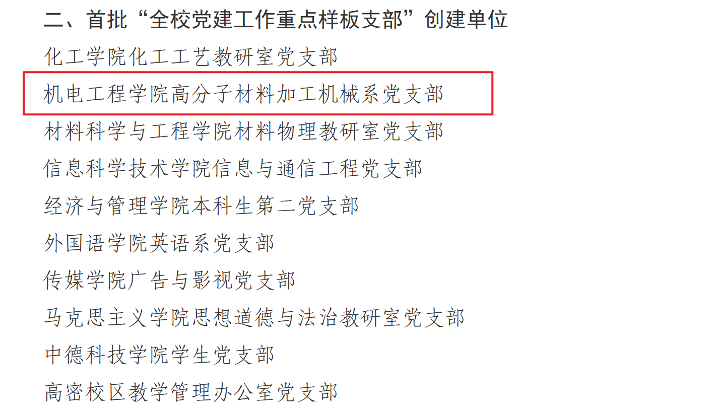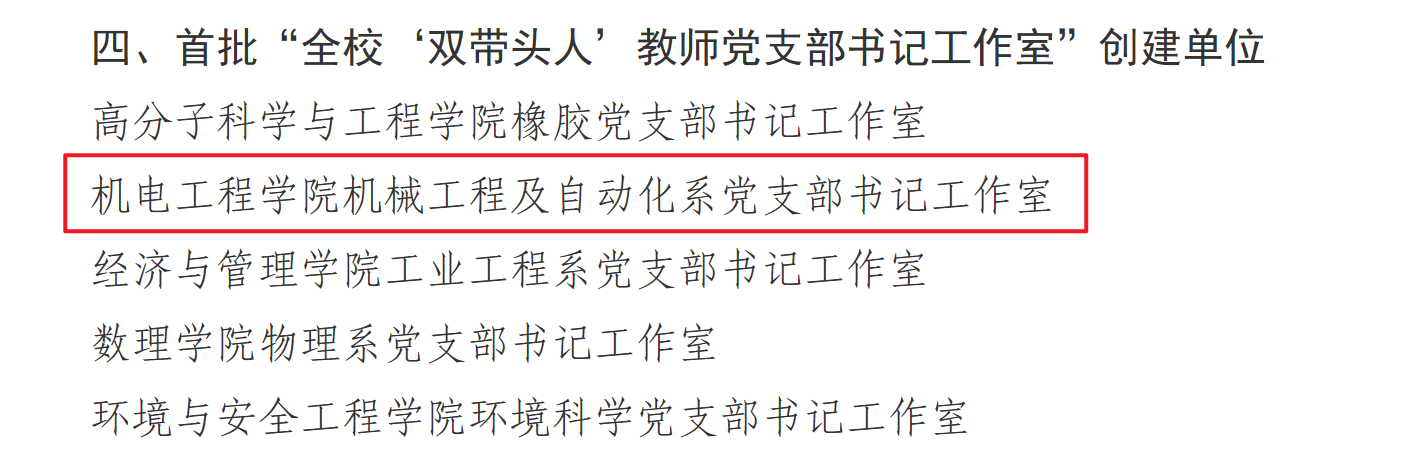 米乐mile官方网站党委荣获多项佳绩,其中,学院党委入选首批“全校党建工作标杆院系”创建单位,高分子材料加工机械系党支部入选首批“全校党建工作重点样板支部”创建单位,机械工程及自动化系党支部书记工作室入选首批“全校‘双带头人’教师党支部书记工作室”创建单位,2022级硕士研究生张晓楠入选首批“全校研究生党员标兵”。