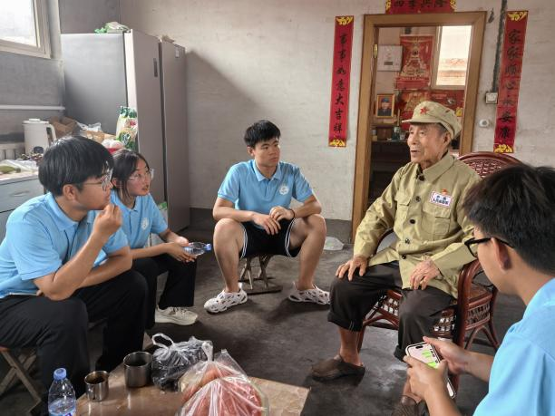 怀揣着对革命先辈的崇高敬意,队员们走进抗美援朝老兵张金海的家中,与革命前辈亲切交流,聆听老人讲述峥嵘岁月。96岁抗美援朝老兵张金海,抗美援朝期间为23军67师战士,身着军装,身姿挺拔,说话铿锵有力,眼神中闪烁着光芒,向队员们讲述了抗美援朝作战的种种细节:“53年,一天晚上我在外面站岗,听着草唰啦哗啦地响,赶快喊美国兵来了!把炮对准山下,轰隆轰隆地开炮打,美国兵才下山了,然后轻机枪重机枪就对着我们打,他们炮火也来了,打得我们躲在山洞里。俺们那个山洞站不开,只能掉头打”惊心动魄的场景通过老人生动的描述让人声临其境,队员们深刻感受到了抗美援朝战争的艰辛与伟大。先辈们用生命和鲜血捍卫了祖国的尊严与和平,用忠诚和热血书写了中华民族的英雄史诗。