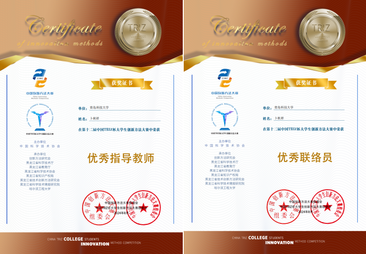 近日,第十二届中国TRIZ杯大学生创新方法大赛在哈尔滨工程大学举办,全国26个省、自治区、直辖市的4397项作品参赛。经过激烈角逐,青岛科技大学TRIZ创新方法协会代表米乐官网再次取得了竞赛成绩的突破:国赛一等奖4项,国赛二等奖8项,国赛三等奖12项,获奖数量居全国参赛高校第3名。协会指导老师卜秋祥副教授连续五届荣获“优秀指导老师”和“优秀联络员”称号,米乐官网连续五届荣获“优秀组织单位”殊荣。