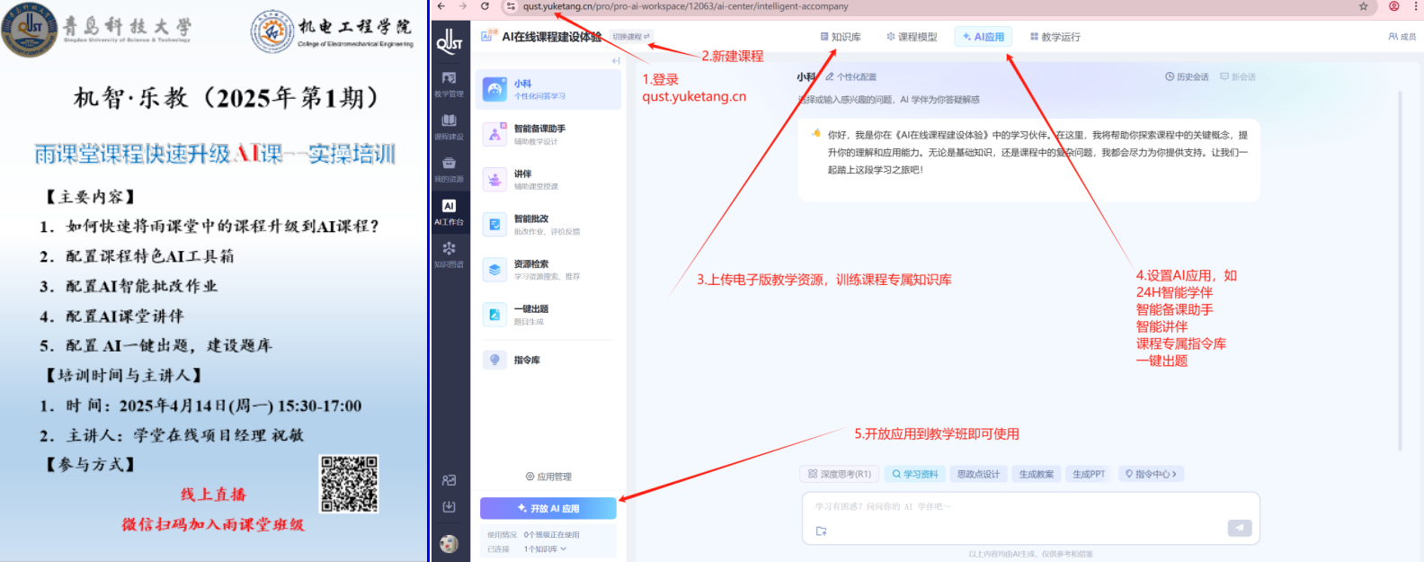 当前,人工智能技术在教育领域的渗透加速,但教师群体普遍面临“工具不熟、场景不明、实践不足”的困境。为进一步加强米乐官网教师的数智意识,助力教师拥抱人工智能,积极探索新环境下的教育教学新模式和技术路径,学院于4月14日开启了“机智·乐教”系列首期培训。本次活动基于学堂在线平台,邀请平台祝经理做了“雨课堂课程快速升级AI课——实操培训”线上报告,为老师们AI课程入门传经送宝,破解教师AI应用难题。