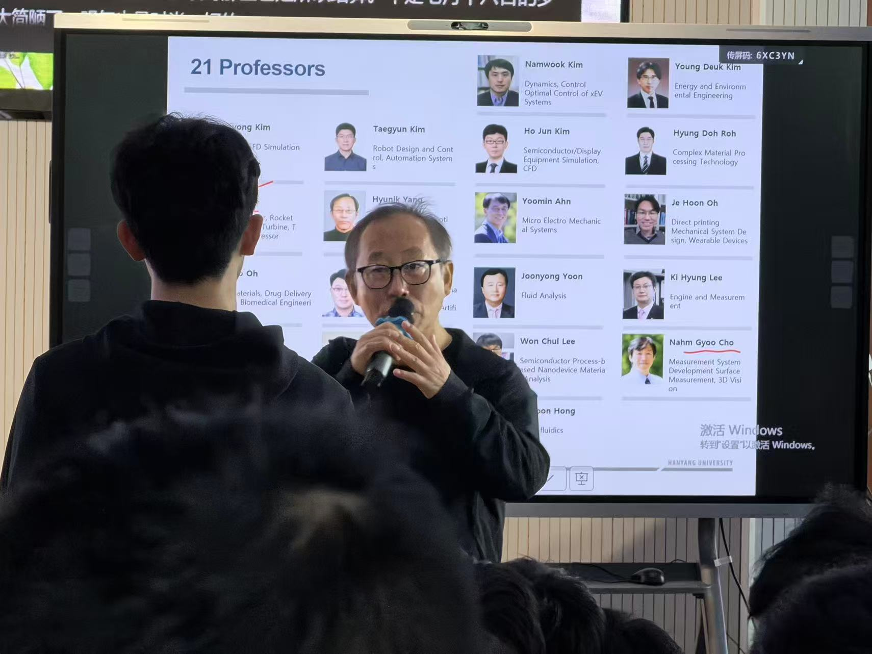 梁铉益重点解读了汉阳大学的核心竞争优势,通过分享留学生前辈的学业案例,结合全球机械工程领域的发展趋势,深入剖析了行业前沿方向。赵南圭从个人成长与当地的留学生活两方面进行指导。他鼓励同学们在异国求学中不畏艰难,主动了解并融入当地文化,积极借鉴留学生前辈的经验智慧。互动交流环节气氛热烈,学生们围绕留学期间的学习状况、语言能力标准、学分规则、毕业深造与就业前景等进行交流。