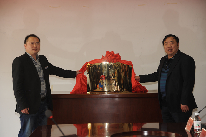 汪传生和王守涛为青岛科技大学龙翔实业研发中心揭牌。