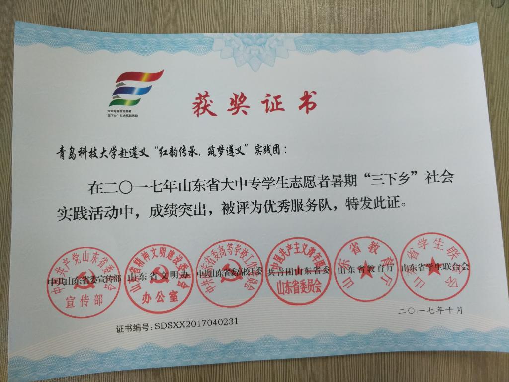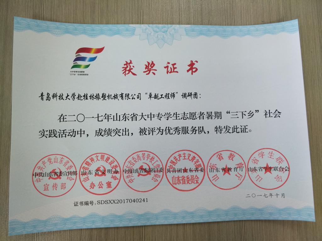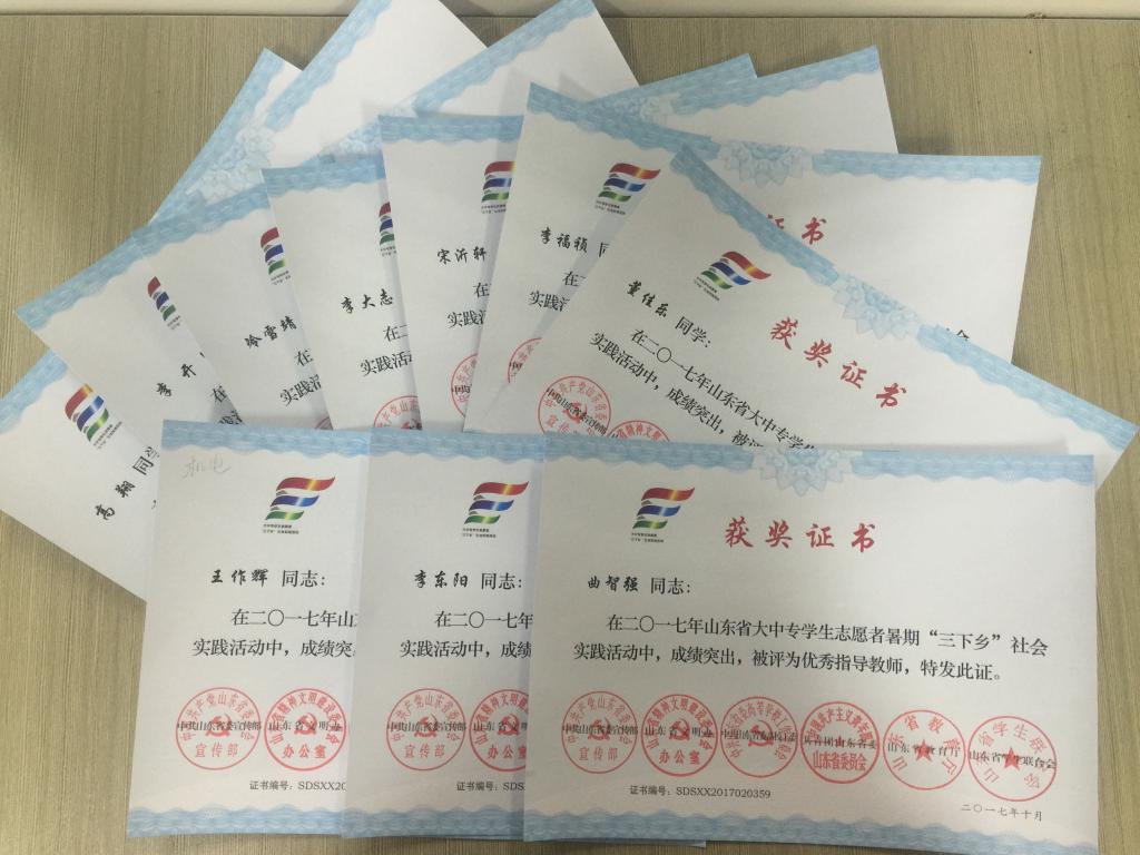 近日,2017年山东省大中专学生志愿者暑期文化科技卫生“三下乡”社会实践活动先进集体和先进个人的证书下发,米乐mile官方网站赴桂林橡塑机械有限公司“卓越工程师”调研团、赴遵义“红韵传承,筑梦遵义”实践团2支队伍获得2017年山东省优秀服务队称号,王作辉、曲智强、李东阳被评为2017年山东省社会实践活动优秀指导教师,高翔、李开、冷雪靖、李大志、宋沂轩、李福祯、董佳乐7名学生荣获2017年山东省社会实践活动优秀学生。