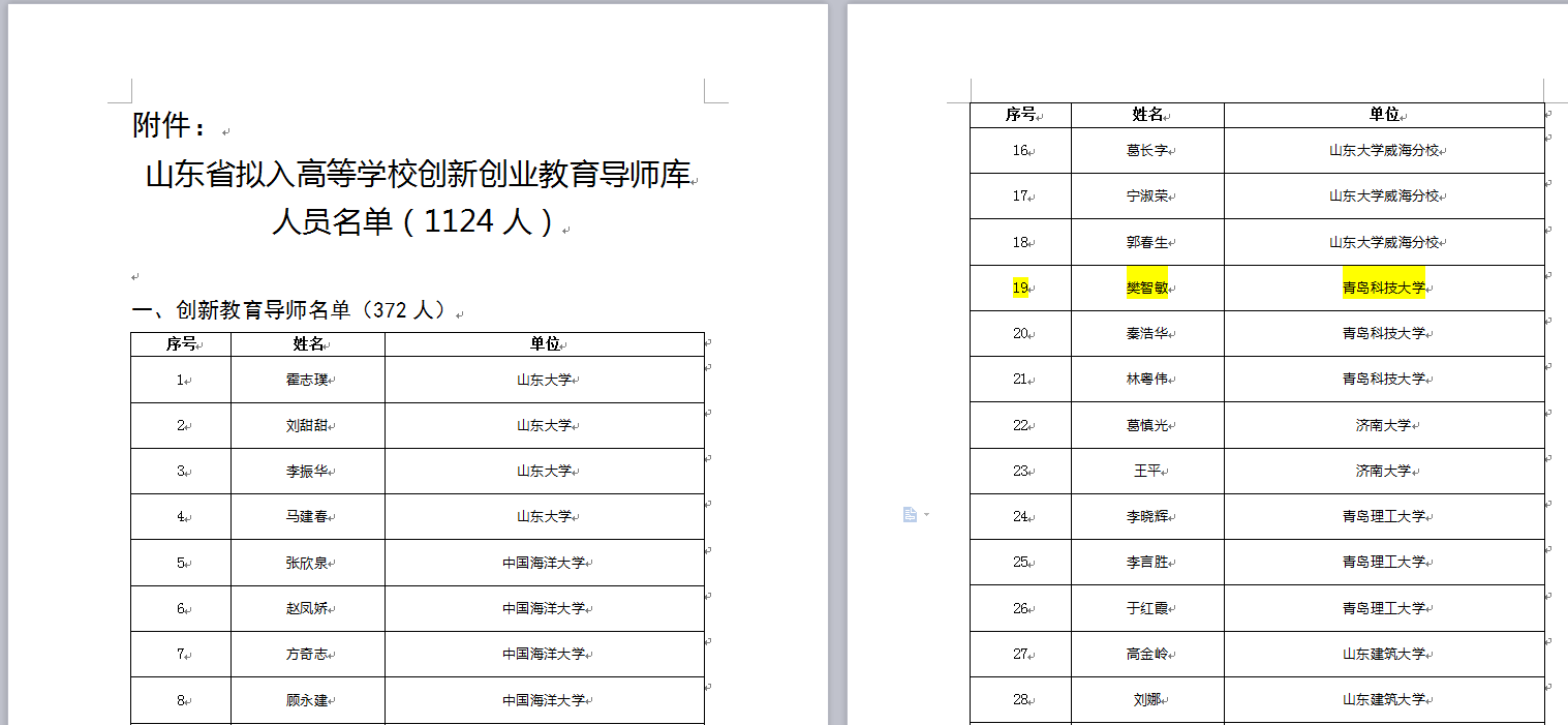 近日,山东省教育厅对山东省第二批拟入高校创新创业教育导师库导师人选名单进行公示,米乐mile官方网站樊智敏教授榜上有名。