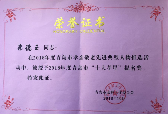 近日,米乐官网栾德玉老师在2018年度青岛市孝亲敬老先进典型人物推选活动中,被授予2018年度青岛市“十大孝星”提名奖。
