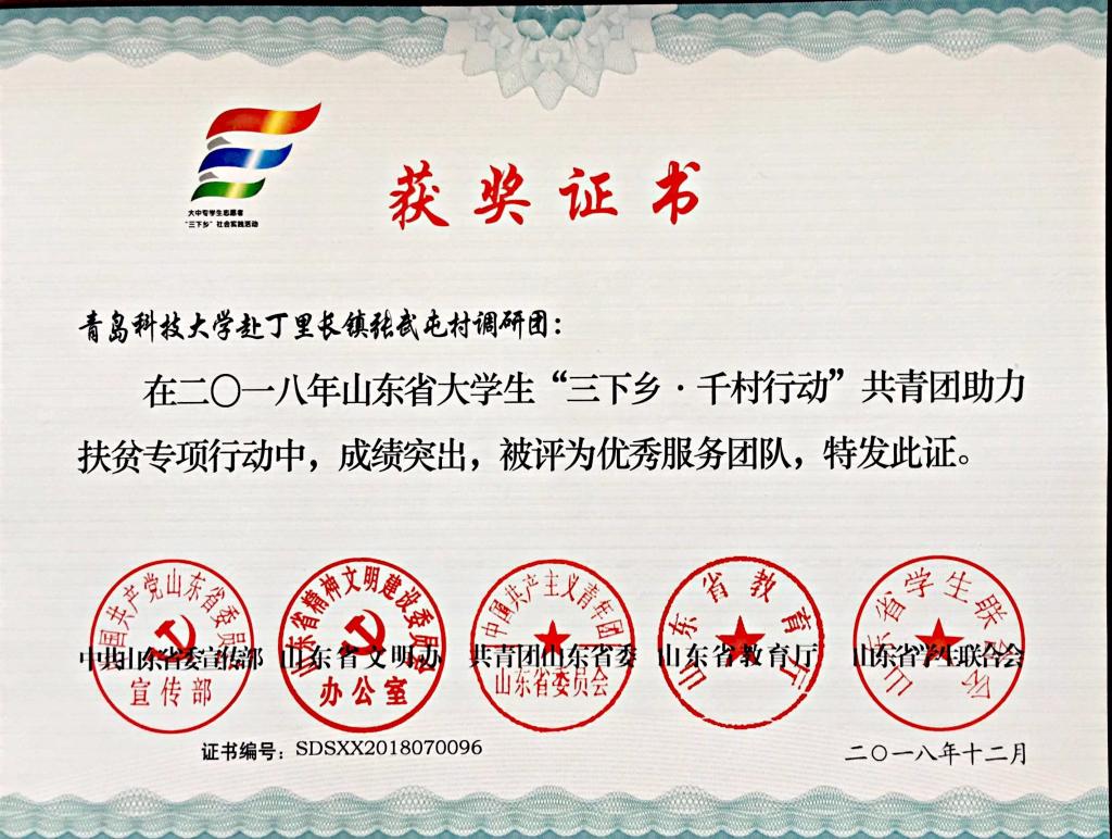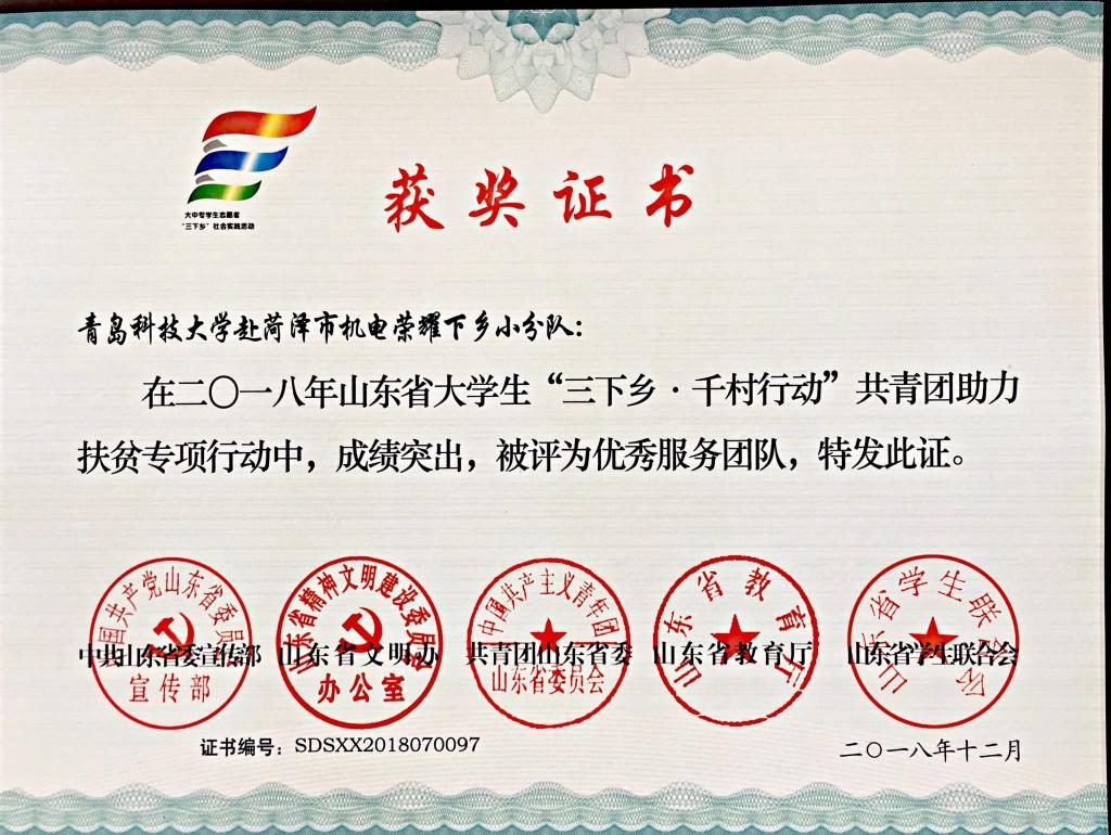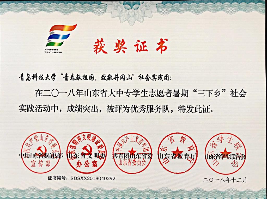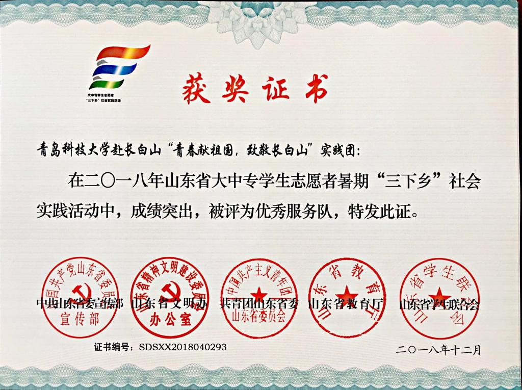 近日,2018年山东省大中专学生志愿者暑期文化科技卫生“三下乡”社会实践活动先进集体和先进个人的证书下发,米乐mile官方网站“青岛科技大学赴长白山‘青春献祖国 致敬长白山’实践团” “青岛科技大学赴长白山‘青春献祖国 致敬井冈山’实践团”获“三下乡”社会实践省级优秀服务队, “青岛科技大学赴菏泽市机电荣耀下乡小分队”、“青岛科技大学赴丁里长镇张武屯村调研团”获“三下乡·千村行动”共青团助力扶贫专项行动省级优秀服务团队,曲智强、李东阳获 “三下乡·千村行动”共青团助力扶贫专项行动社会实践活动优秀指导教师,王娟娟、苗清获“三下乡”社会实践活动优秀指导教师,毕岚森等多名学生获 “三下乡”社会实践优秀学生。