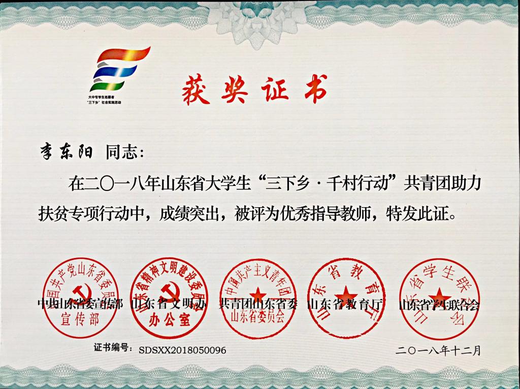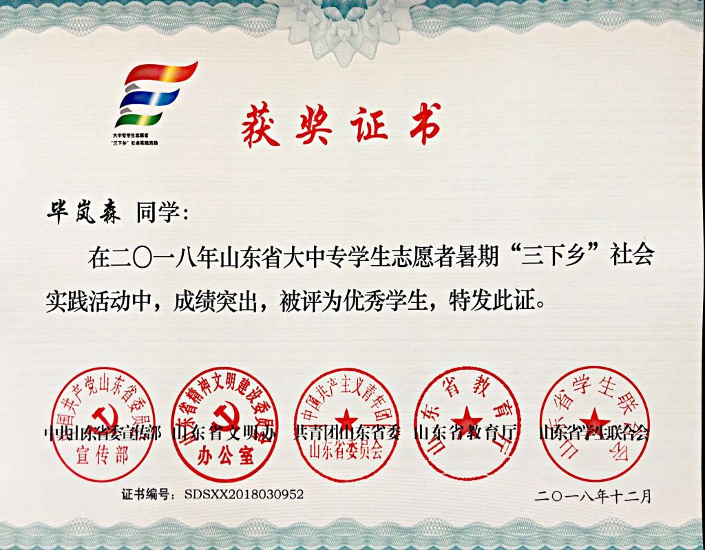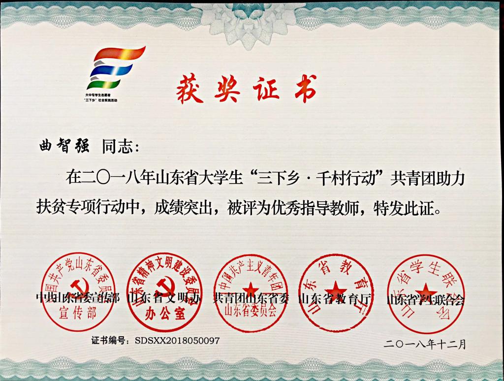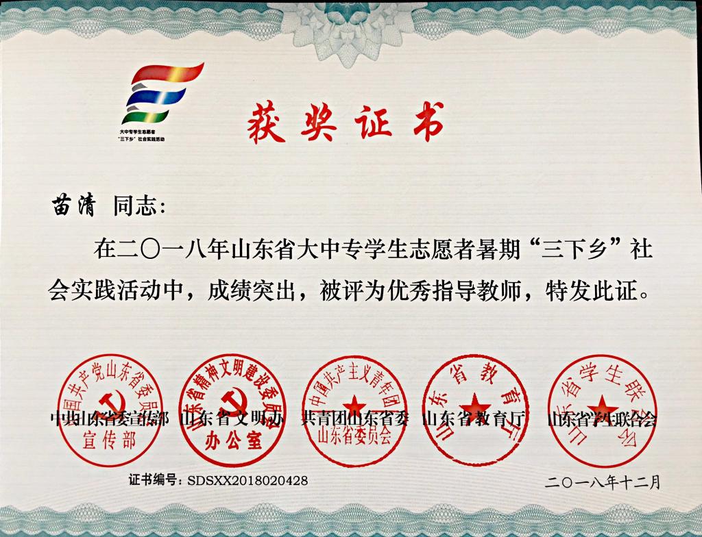 近日,2018年山东省大中专学生志愿者暑期文化科技卫生“三下乡”社会实践活动先进集体和先进个人的证书下发,米乐mile官方网站“青岛科技大学赴长白山‘青春献祖国 致敬长白山’实践团” “青岛科技大学赴长白山‘青春献祖国 致敬井冈山’实践团”获“三下乡”社会实践省级优秀服务队, “青岛科技大学赴菏泽市机电荣耀下乡小分队”、“青岛科技大学赴丁里长镇张武屯村调研团”获“三下乡·千村行动”共青团助力扶贫专项行动省级优秀服务团队,曲智强、李东阳获 “三下乡·千村行动”共青团助力扶贫专项行动社会实践活动优秀指导教师,王娟娟、苗清获“三下乡”社会实践活动优秀指导教师,毕岚森等多名学生获 “三下乡”社会实践优秀学生。