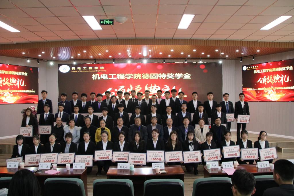 在昂扬的校歌中,陈刚处长、王锋业书记、何燕院长、魏振文董事长、崔建波副总经理分别给获得德固特学业优秀奖学金、德固特科创新秀奖学金同学颁奖。毕岚森同学作为学生代表进行了发言。