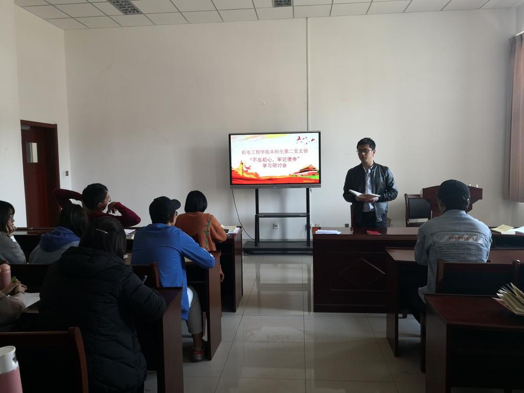 为不断推动主题教育入心入脑,深入学习贯彻习近平新时代中国特色社会主义思想,不断坚定广大学生党员的理想信念,11月8日中午,米乐mile官方网站本科生第二党支部开展“不忘初心、牢记使命”主题教育集中学习研讨会,全体党支部党员参加了学习研讨,党支部书记曲智强主持学习研讨会。