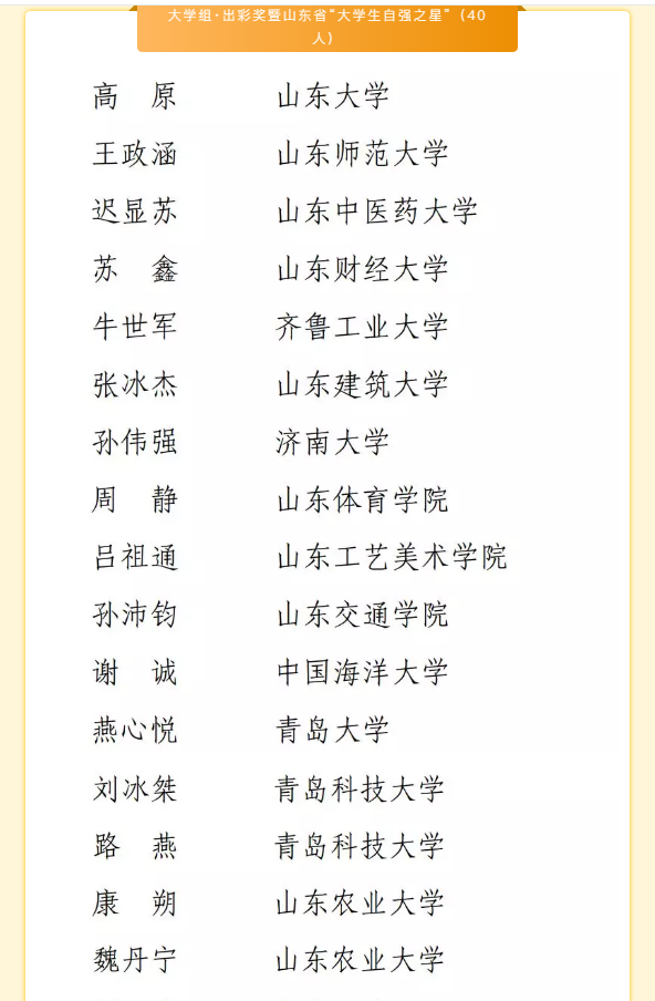 近日,在山东省学生联合会公布的2019年“大智之星”齐鲁学子奖学金获奖名单公示中,米乐官网学子刘冰桀荣获大学组--出彩奖暨山东省“大学生自强之星”。