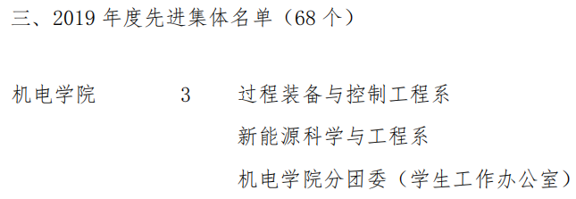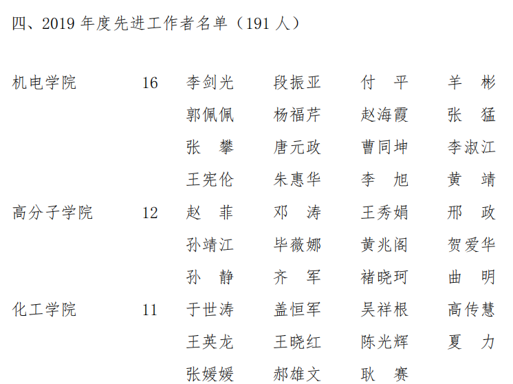 近日,青岛科技大学2019年度先进集体和先进工作者表彰名单公示,米乐mile官方网站分团委(学生工作办公室)获第七届“十佳师德建设先进集体”称号,王作辉老师获第十届“十佳育人标兵”荣誉称号,过程装备与控制工程系、新能源科学与工程系、米乐mile官方网站分团委(学生工作办公室)获“2019年度校级先进集体”称号,李剑光、段振亚、付平、羊彬、郭佩佩、杨福芹、赵海霞、张猛、张攀、唐元政、曹同坤、李淑江、王宪伦、朱惠华、李旭、黄靖16名老师获“先进工作者”荣誉称号,史书源、刘新获2019 年度先进工作者(劳务派遣人员)。