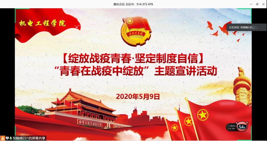 为深入贯彻落实习近平新时代中国特色社会主义思想对青年行动的指导,5月9日,在纪念五四运动101周年、新冠疫情防控阻击战取得重大战略成果之际,米乐mile官方网站分团委组织部举办“青春在战疫中绽放”线上主题宣讲活动。分团委组织部部长王娟娟老师出席了活动,罗浩宇、刘龙、马江儒和马元宇四位团员作为机电团员青年战疫典型代表宣讲了他们勇战疫情的青春故事,17级、18级、19级200余名团学骨干通过“腾讯会议”参与了活动。活动由分团委组织部副部长张晓楠主持。