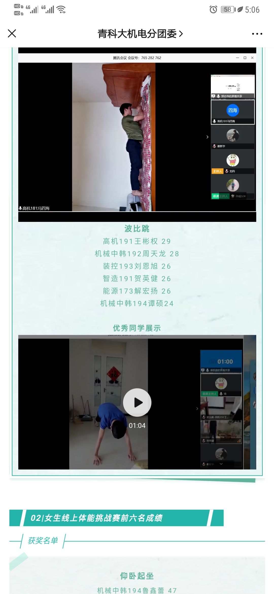 为了响应山东省教育厅和学校关于“线上教育要重视学生心理健康”的工作要求,帮助学生缓解焦虑情绪,活跃学生居家锻炼氛围,米乐mile官方网站举办了“莘莘学子共庆七十华诞,矫健英姿同战疫疠瘟情”线上体能挑战赛。比赛分男子组和女子组,男子组项目有一分钟俯卧撑、一分钟波比跳、平板支撑;女子组项目有一分钟仰卧起坐、一分钟开合跳、平板支撑,活动中,选手们在家运动,线上比赛,不断强健学子体魄。