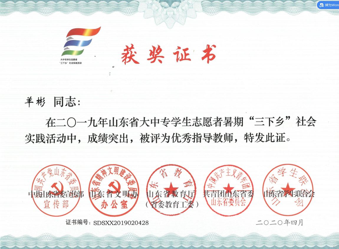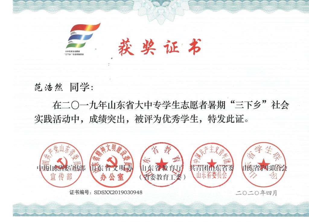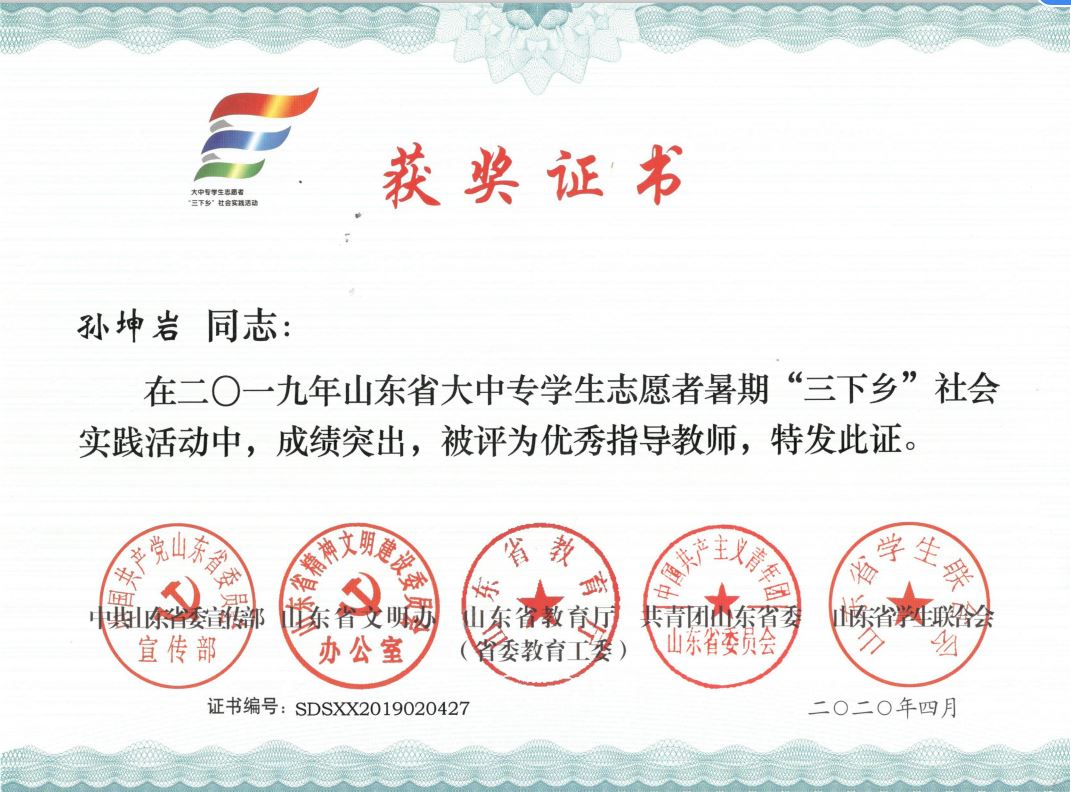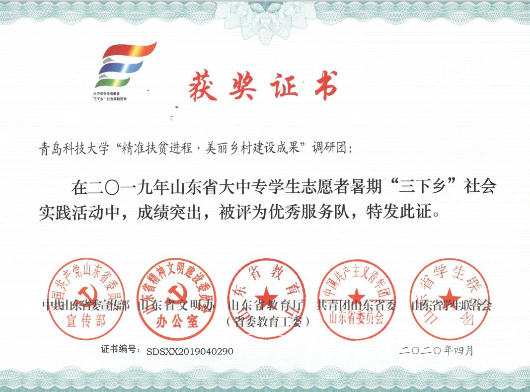 近日,2019年山东省大中专学生志愿者暑期文化科技卫生“三下乡”社会实践活动先进集体和先进个人的证书下发,米乐mile官方网站“青岛科技大学精准扶贫进程 美丽乡村建设成果”调研团、获“三下乡”省级优秀服务团队,孙坤岩、羊彬获“三下乡”社会实践活动优秀指导教师,籍翔宇、张晓楠、范浩然、马晓东获 “三下乡”社会实践优秀学生。
