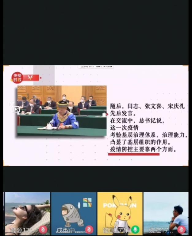 会上,首先由邢坤老师带领党员们学习观看了《荆楚东风起,浴火正重生——习近平参加湖北代表团审议纪实》视频并带头领学了“习近平在中央政治局第二十二次集体学习时强调充分认识颁布实施民法典重大意义,依法更好保障人民合法权益”的重要讲话内容,并分享了自己对于民法典的颁布和实施的看法与感悟。党支部学生党员积极发言,分享了学习后自己关于民法典对依法治国和法治社会建设的作用的感想和学习成果,并从自身角度和经历出发,交流了对观看《习近平参加湖北代表团审议纪实》视频的感想,大家互相交流,收获颇丰。最后党支部书记曲智强老师做出总结,指出目前严峻形势前所未有,我们要适应形势,适应变化,做好心理准备,把握形势判断,趁势而上;面对工作要行稳致远,做好细枝末节容不得半点马虎;更要登高望远,不获全胜不撤退,面对困难凝心聚力,并对学生党员提出要求,在人生十字路口要一鼓作气越战越勇。主题活动圆满结束。