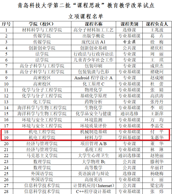 近日,在学校公布的青岛科技大学第二批“课程思政”教育教学改革试点立项课程的通知中,米乐官网付平老师的《机械制造基础》与朱惠华老师的《材料力学》两门课程荣获立项。
