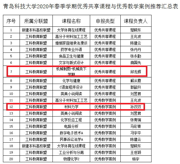 据悉,此次评选是根据省教育厅《关于开展2020年春季学期优秀共享课程与优秀教学案例评选活动的通知》文件要求,学校开展了2020年春季学期优秀共享课程与优秀教学案例评选活动。经教师个人审报、学院推荐、专家评审,最终评选出青岛科技大学2020年春季学期优秀共享课程10门、优秀教学案例10个。