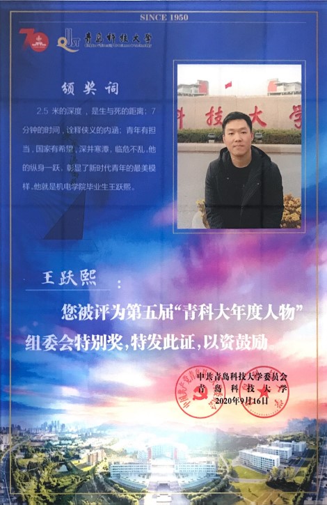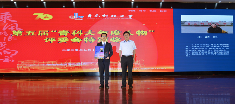 在70周年校庆来临之际,第五届青岛科技大学年度人物颁奖典礼于2020年9月17日于二报举行。米乐官网校友19届校友王跃熙获评第五届“青科大年度人物”评委会特别奖。他勇救落井工人,被中央电视台等媒体广泛报道。他先后获得“崂山区见义勇为先进个人”、“山东好人之星”等荣誉,并于2019年3月入选中央宣传部、中央文明办主办的中国好人榜。青年有担当,国家有希望。他的纵身一跃,彰显了新时代青年最美的模样。校党委学生工作部、学生工作处处长王锋业为王跃熙颁奖。