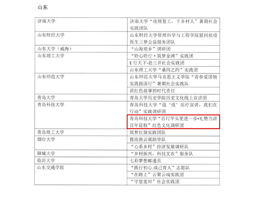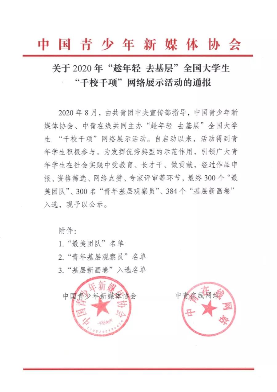 近日,由共青团中央宣传部指导,中国青少年新媒体协会、中青在线共同主办的“趁年轻 去基层”全国大学生“千校千项”网络展示活动顺利举行。自启动以来活动得到青年学生的积极参与,经过作品申报、资格筛查、网络点赞、专家评审等环节,最终在《关于2020年“趁年轻 去基层”全国大学生“千校千项”网络展示活动的通报》中,米乐官网耿宇轩同学带领的青岛科技大学“百尺竿头更进一步·礼赞党建百年征程”红色文化调研团获评此次活动“最美团队”荣誉称号。