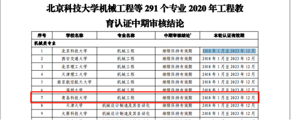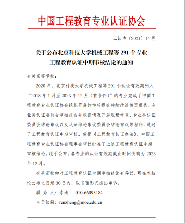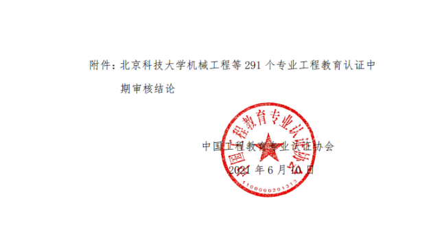 近日,中国工程教育专业认证协会发布了《关于公布北京科技大学机械工程等291个专业工程教育认证中期审核结论的通知》,米乐官网机械工程和过程装备与控制工程两个专业在列,审核结论为“继续保持有效期”,本轮认证有效期为“2018年1月至2023年12月”。