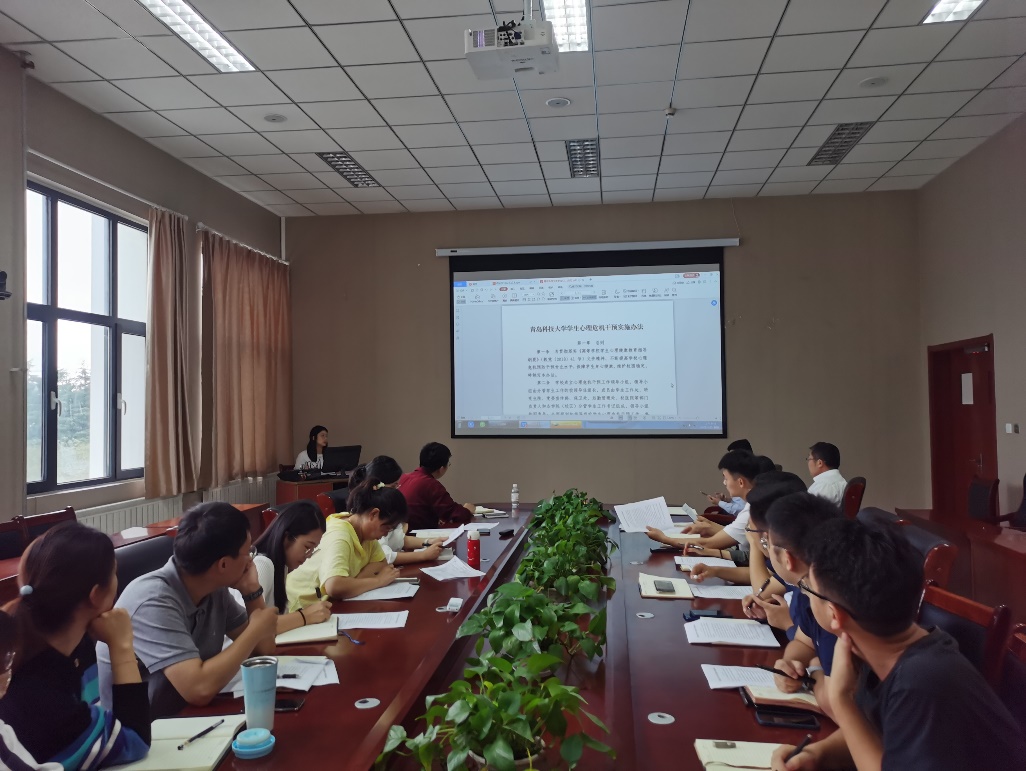 肖强指出,学生心理工作是学院安全稳定和保护学生健康成长的基石,要丰富工作载体、拓展工作思路,并就抓实抓细学生心理健康工作,如何规范学生心理咨询与服务,更好适应和满足学生成长成才需求,保障学生心理健康与生命安全,提出六个方面的工作建议和要求:一是明确工作形势,提高思想认识;二是突出工作目标,注重预防干预;三是加强人文关怀,及时心理疏导;四是规范基础工作,强化履职尽责;五是推动信息共享,加强“校、院、班、舍”四级联动;六是开展心理研究,提升工作质量。会上,郭佩佩组织学习了《青岛科技大学大学生心理危机干预实施办法》等相关文件。