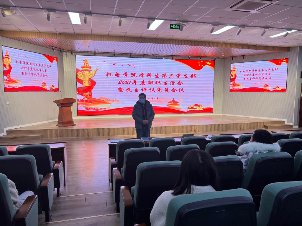 2022年3月20日下午,机电学院本科生第三党支部在机电楼530会议室召开了2021年度组织生活会暨民主评议党员会议,开展民主评议工作。党支部全体党员参加会议,会议由党支部书记王作辉主持。
