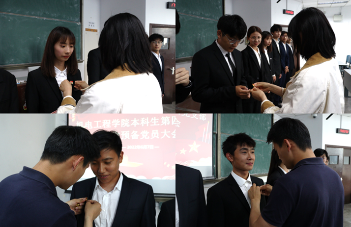 孙坤岩、管羽代表支部向新加入的同志表示祝贺,并为其佩戴党员徽章。同志们经过不懈努力顺利加入党组织,激动喜悦的心情溢于言表。