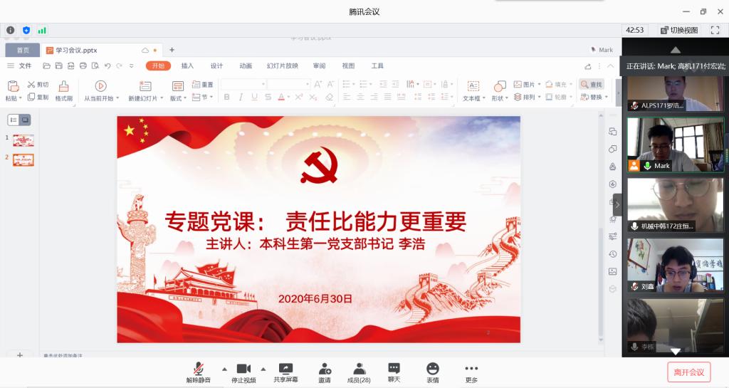 为贯彻落实全国全省基层党建工作重点任务推进会精神,根据中组部“党课开讲啦”活动安排、省委组织部和学校有关通知要求,按照学校《关于开展“我来讲党课”活动的通知》部署,6月30日下午,米乐mile官方网站本科生第一党支部书记李浩在腾讯会议主讲“迎七一”专题党课。全体学生党员参加党课学习,会议由王玉凯老师主持。