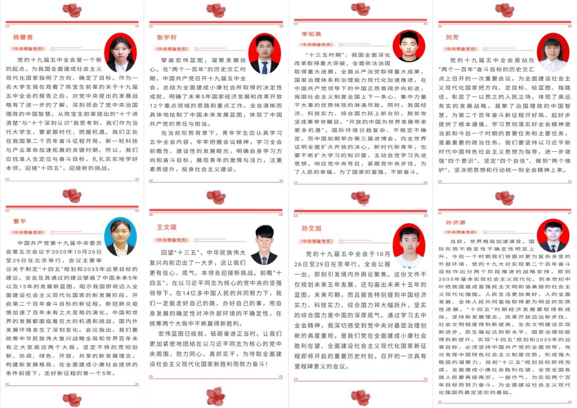 十九届五中全会站在党和国家事业发展全局高度,按照党的十九大对实现第二个百年奋斗目标作出的分两个阶段推进的战略安排,描绘了我国进入新发展阶段的发展蓝图。通过召开此次组织生活会,全体党员深刻领会了会议精神,坚定了理想信念。学生党员们纷纷表示作为时代青年要乐于拼搏,勇于奉献,敢于担当,在矢志奋斗中谱写新时代的青春之歌。