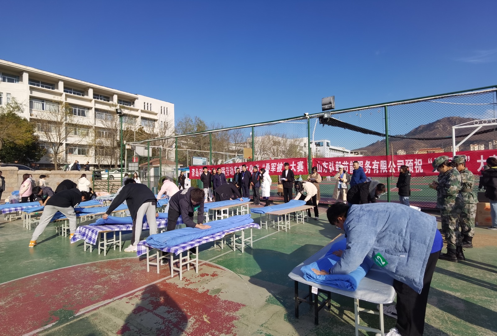 12月7日,以“‘叠’出精彩、‘块’乐生活”为主题的首届学生公寓劳动素养文化节之“叠军被”大赛在崂山校区和四方校区篮球场同时举行。学生处、校团委、后勤管理处相关负责人和各学院学工办、团委负责人应邀观摩了比赛,来自两校区各学院近30个宿舍的150多名学生自愿报名参加了比赛。
