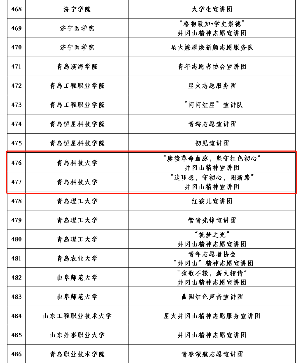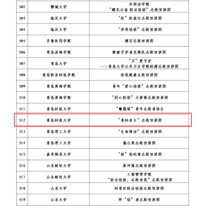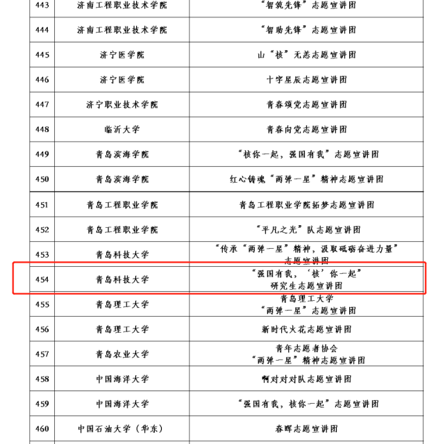 近日,团中央青年志愿者行动指导中心公布2023年全国大学生“两弹一星”精神志愿宣讲团、“防治结核 志愿有我”志愿宣讲团、井冈山精神志愿宣讲团、“七彩假期”志愿服务示范队入选名单,青岛科技大学共11支团队入选,其中米乐mile官方网站5支,为学院参与全国千支大学生志愿宣讲团选拔最好成绩。