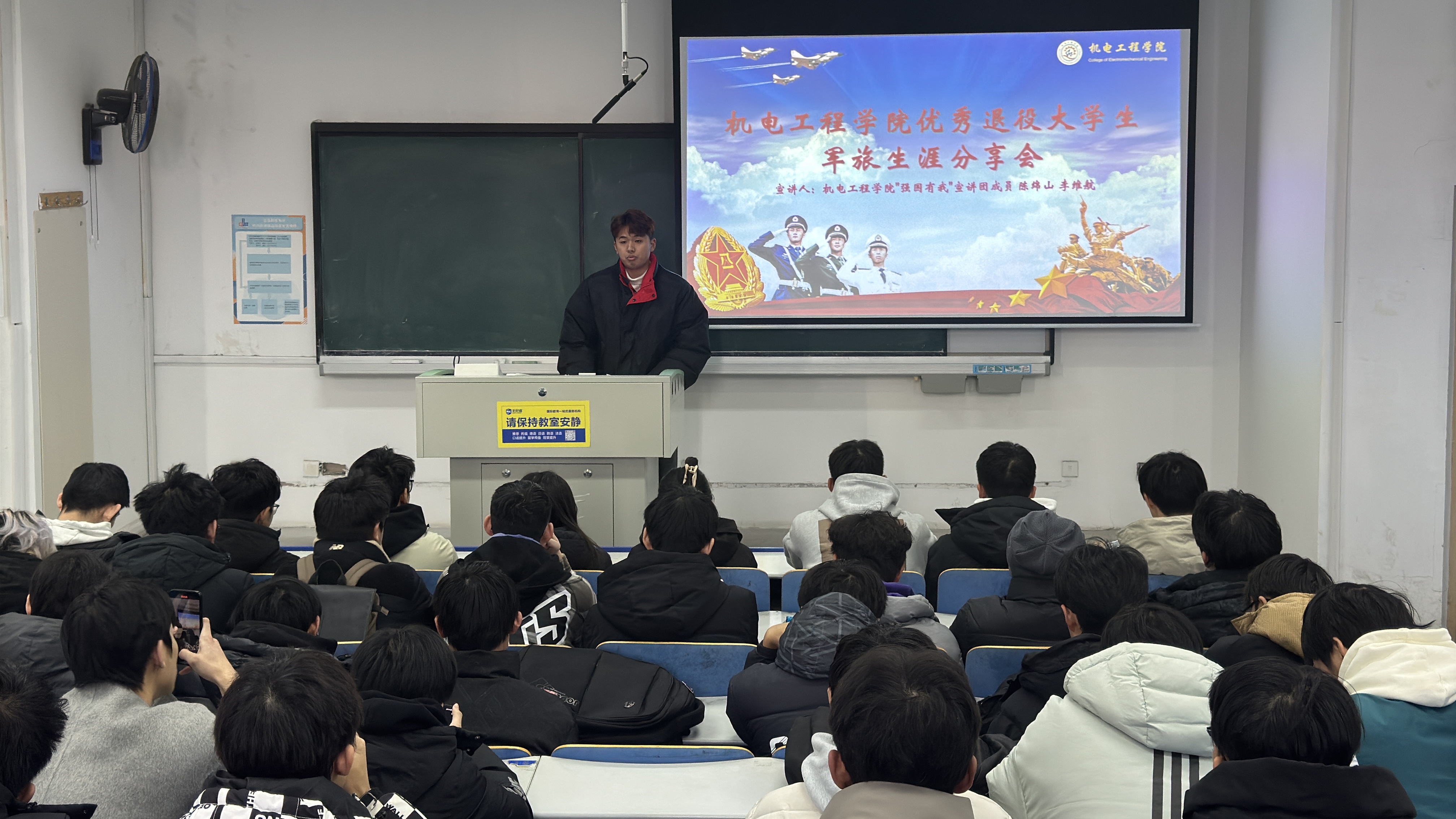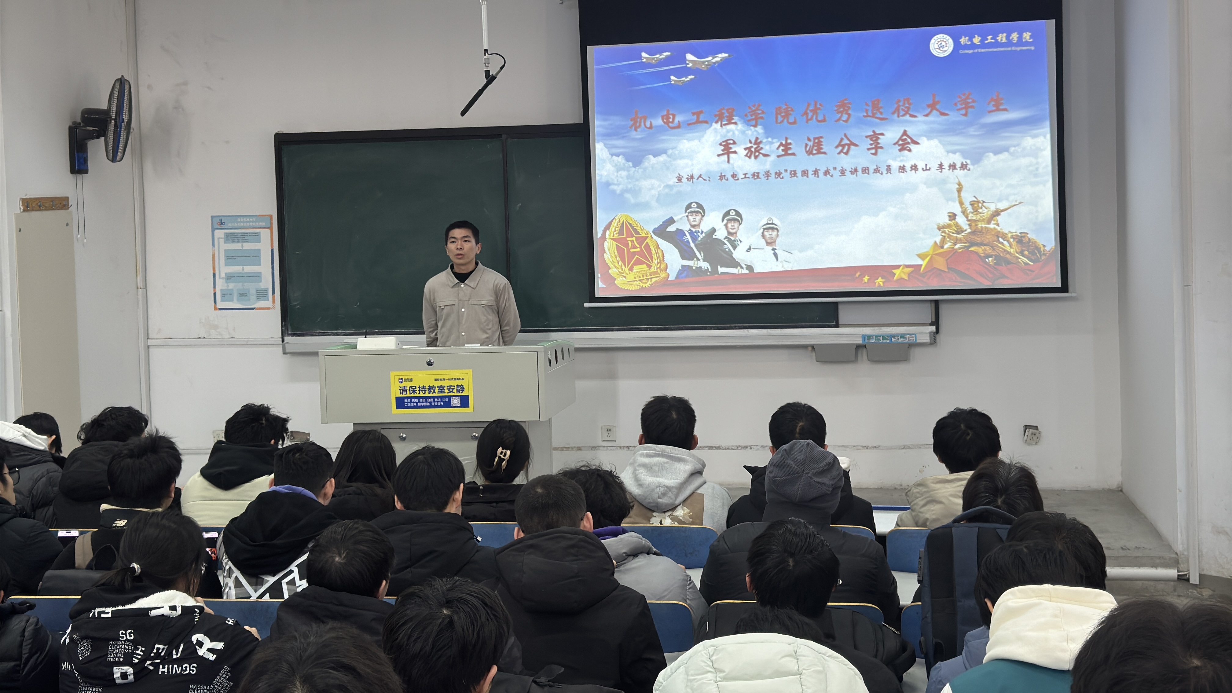 为进一步弘扬爱国主义精神,深化国防教育内涵,鼓励广大学生投身国防事业,米乐mile官方网站于11月10日下午在弘毅楼E201举行了“机逐青春 智戎有我”优秀退役大学生军旅生涯分享会,米乐mile官方网站“强国有我”宣讲团成员陈绵山、李维航和全院师生代表参加活动。