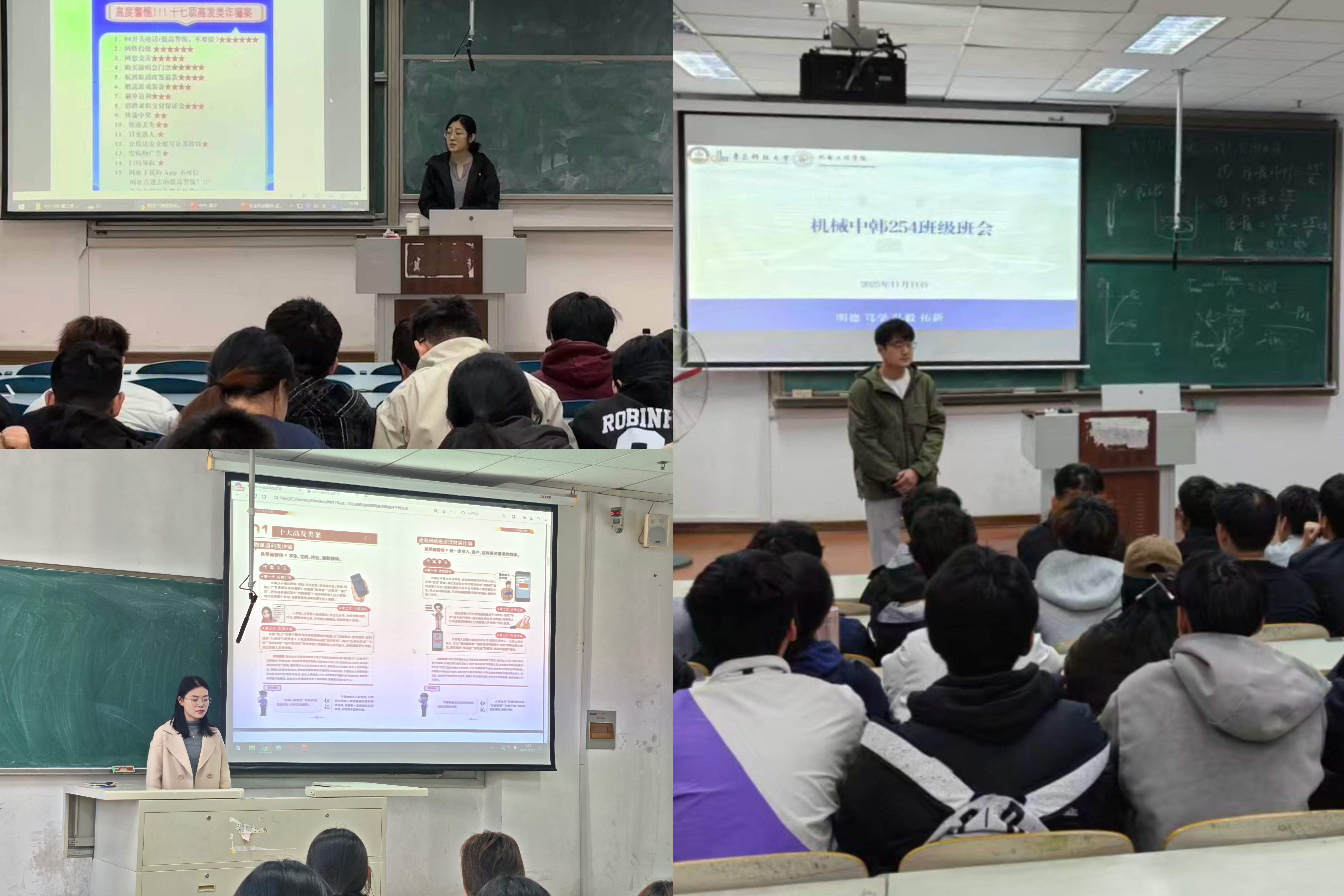 近日,为切实增强学生安全防范意识,全力维护学生的人身、信息和财产安全,米乐mile官方网站持续深入开展“防范电信网络诈骗,共筑平安和谐校园”为主题的安全教育班会,深入学习青岛科技大学印发的《17项高发类诈骗案》学习资料和11月份班主任班会指南。主题班会由各班班主任主持,各班级全体学生参加。