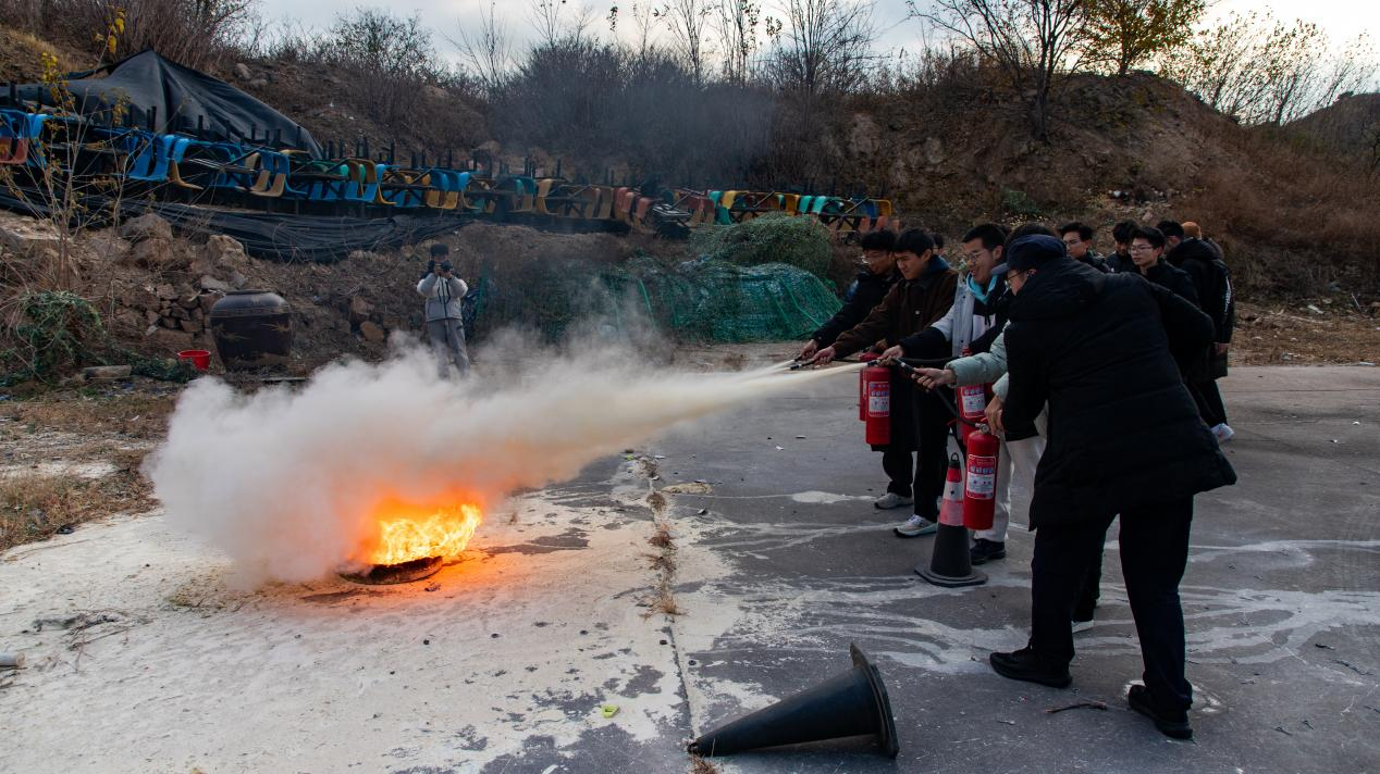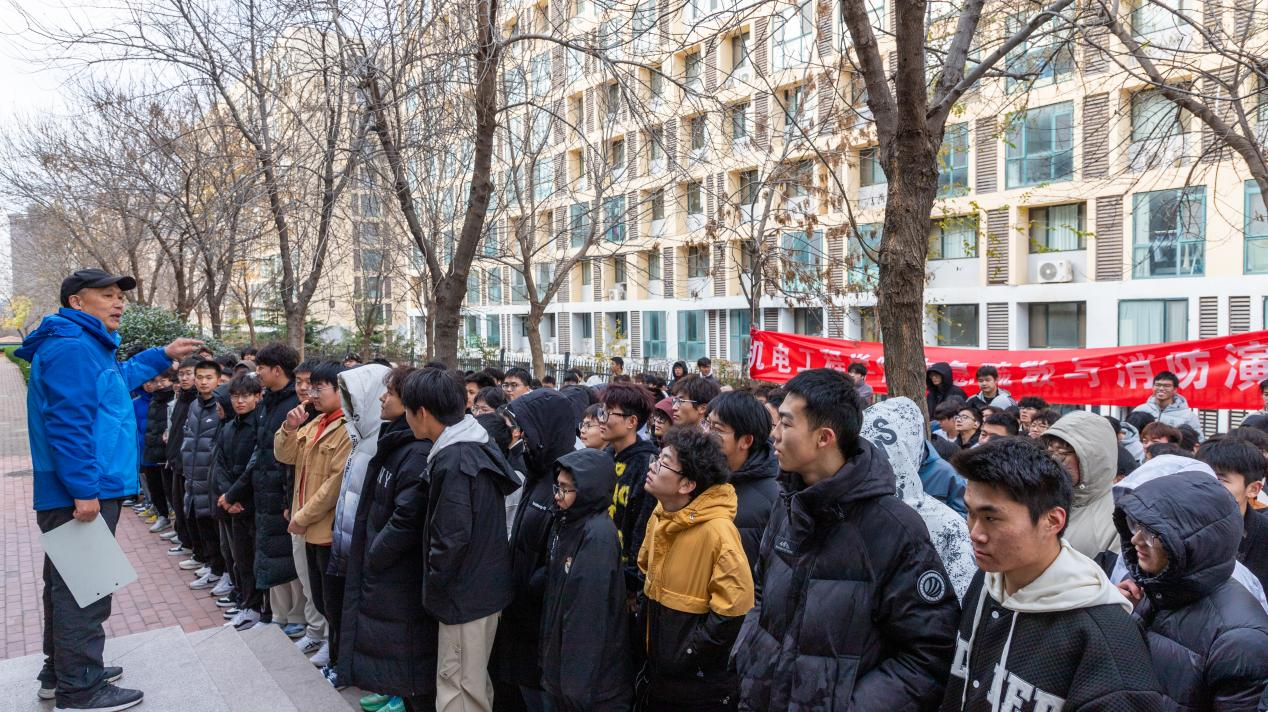 集合完毕后,学校安全管理处赵淑东结合演练实际,围绕消防安全“一懂三会”——懂火灾危险性、会报警、会灭火、会逃生,为同学们系统讲解了防火常识。他通过校园真实案例,重点分析了电器安全、疏散通道管理等常见隐患,强调“预防为主、防消结合”,引导学生将安全理念融入日常。在消防安全实操培训中,现场讲解了干粉灭火器的使用方法,演示了“提、拔、握、压”的操作步骤。同学们分批上前,亲手操作灭火器扑灭火源,在实践中掌握了初期火灾的处置技能。