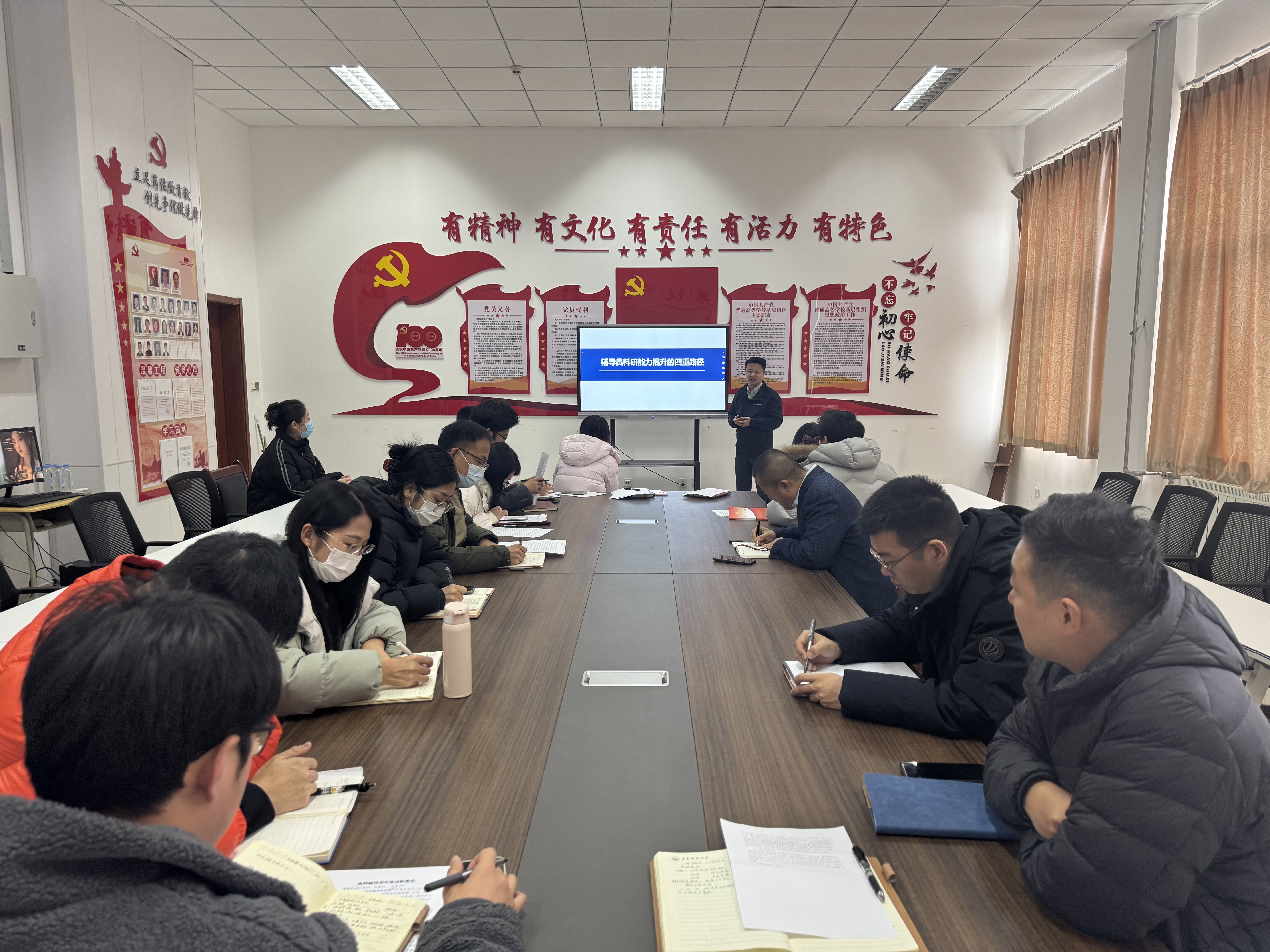会上,全体辅导员围绕辅导员九大职责,结合年度工作实际展开述职。大家以详实的数据、生动的案例,全面展示了在思想引领、学生教育管理服务、学业辅导与就业指导、心理健康教育等方面的工作成果。同时,各位辅导员坦诚剖析了工作中存在的不足,明确了下一步工作规划。本次述职评议会不仅是对2025年度学生工作的系统总结与评议,更是一次“实践交流+能力提升+科研赋能”的综合学习会。