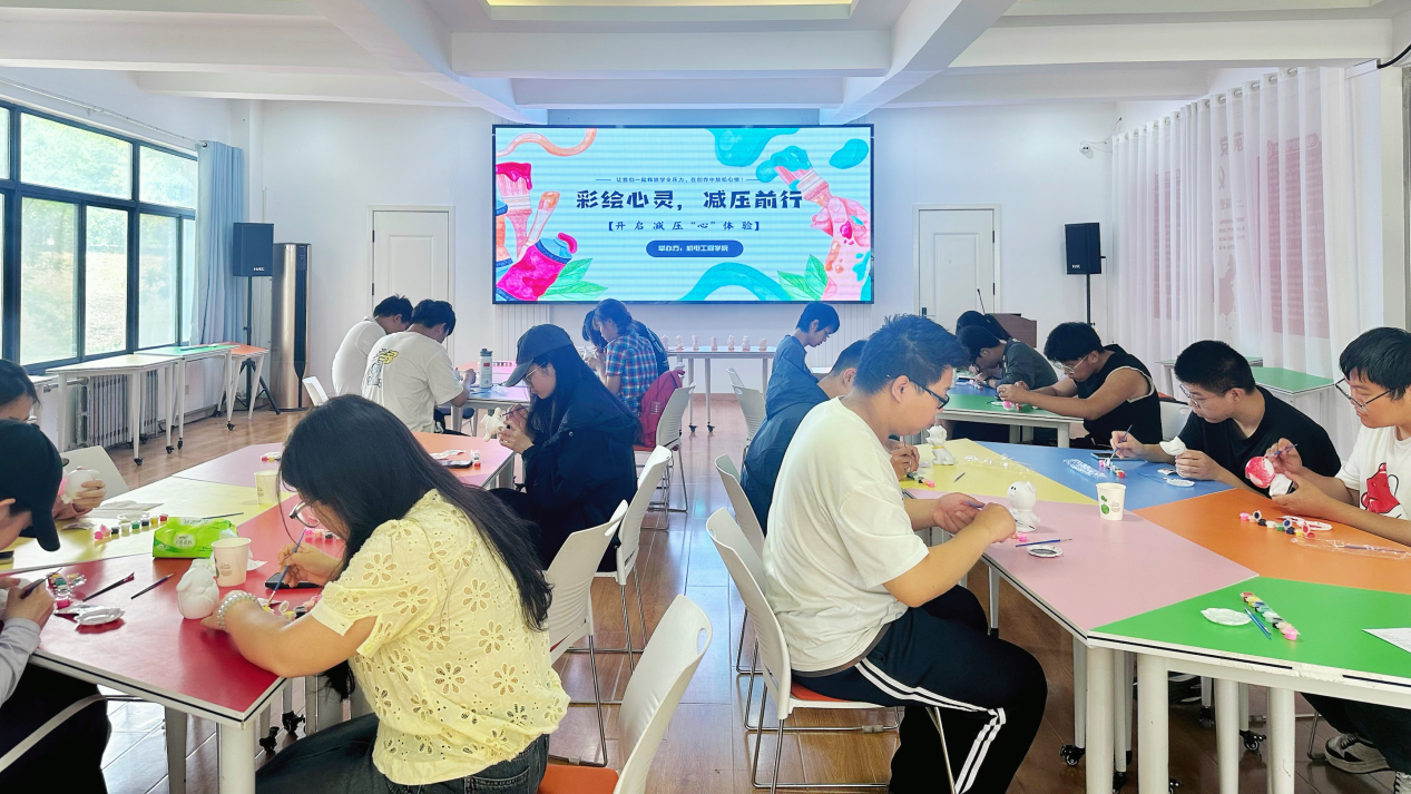 活动现场准备了形态多样的石膏娃娃、10余种颜料及专业绘画工具。随着活动开始,同学们手持画笔专注调配色彩。不少同学表示,“蘸取颜料时能明显感觉到紧绷的神经在放松”,该过程成为无意识的情绪疏导过程。通过石膏娃娃彩绘创作,为学生提供具象化的压力宣泄载体。现场不时传来欢声笑语,气氛轻松愉悦。完成作品后,同学们相互展示交流,分享创作思路与感受,在互动中增进了彼此间的友谊。