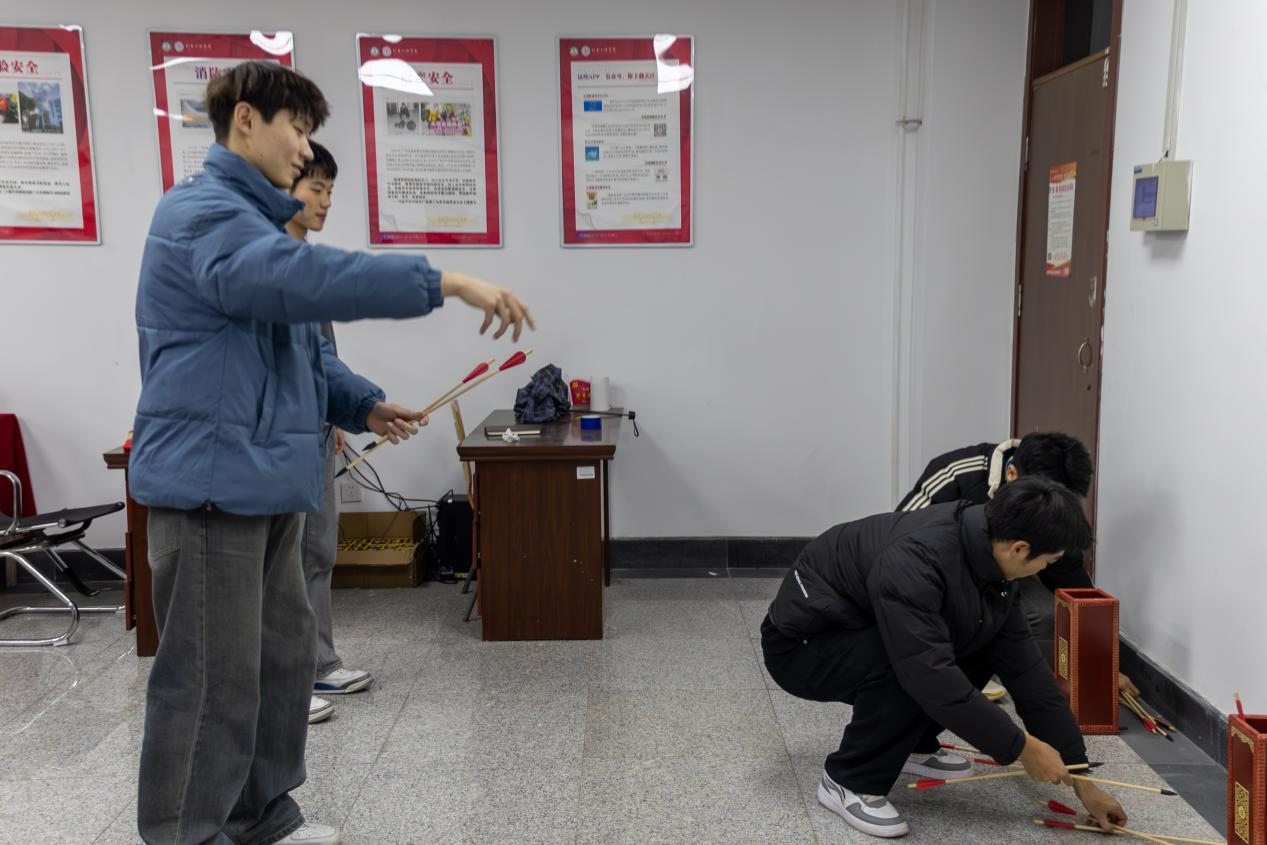 本次趣味运动会以宿舍为单位组队参赛,设置了投壶、趣味接力等兼具趣味性与协作性的比赛项目。其中,投壶比赛凭借传统韵味与竞技乐趣,成为全场焦点。赛场上,参赛选手凝神静气、目光专注,手中的箭羽稳稳抛出,在空中划出优美的弧线。箭矢精准入壶所发出的清脆声响,激发全场热烈掌声,而偶有失手偏航的小插曲,也赢得现场的欢笑声声。选手们彼此支招、相互鼓劲,你来我往间尽显同窗情谊,将活动氛围推向一个又一个高潮。