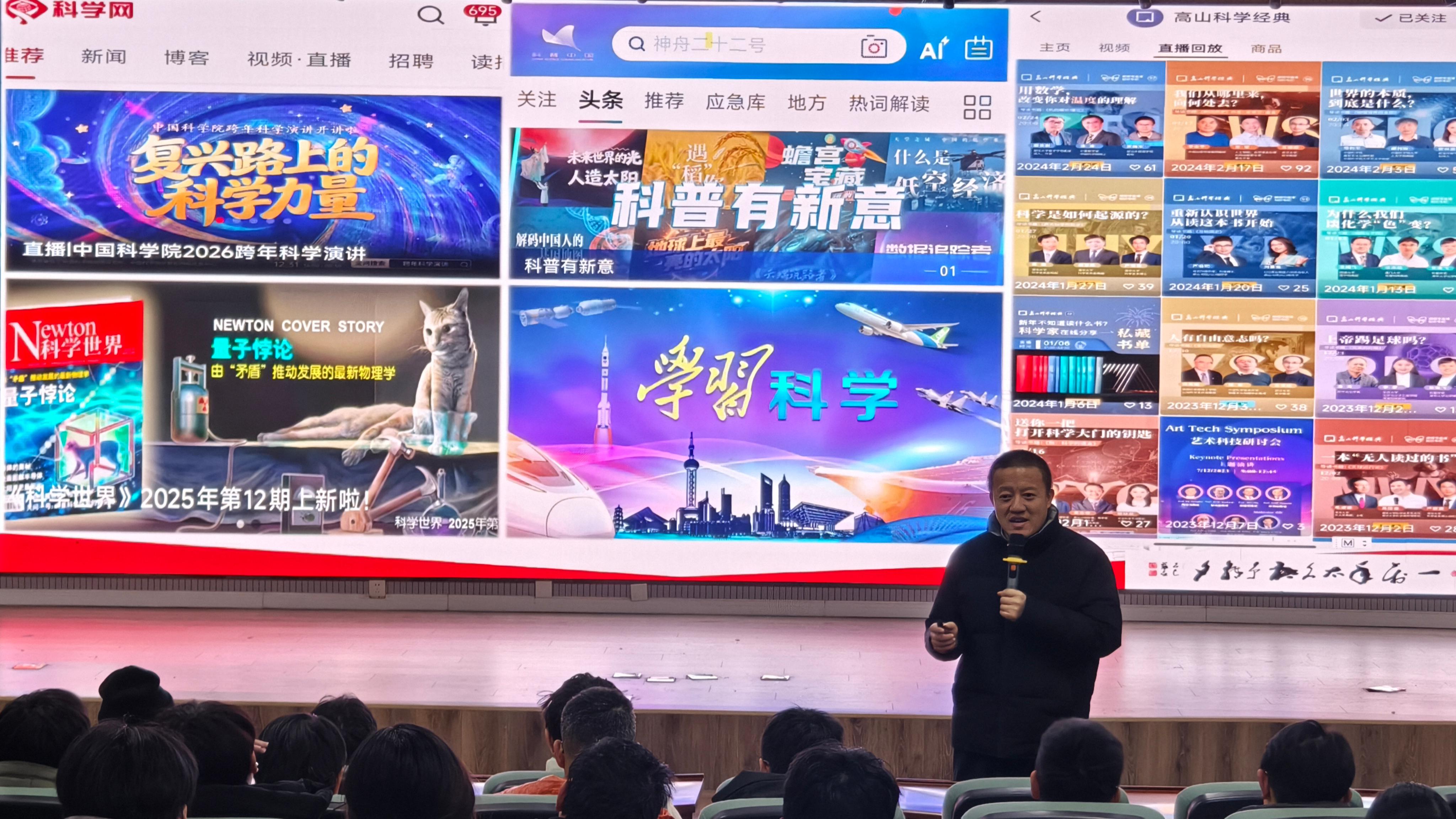 同天,米乐mile官方网站科学技术史学习会成立仪式在D3-530会议室成功举行。大会由学院党委副书记杨小明主持并作了题为“热爱科学、学习科学、运用科学”的报告,协会32名师生成员参会,共同见证学习会成立。现场,协会成员通过观看罗振宇“时间的朋友”主题演讲见证跨年夜的精彩时刻,以知识为友,沉浸式感受人工智能对社会发展、教育变革及个体成长的深远影响,在思想的碰撞中共同迎接2026年元旦的到来。