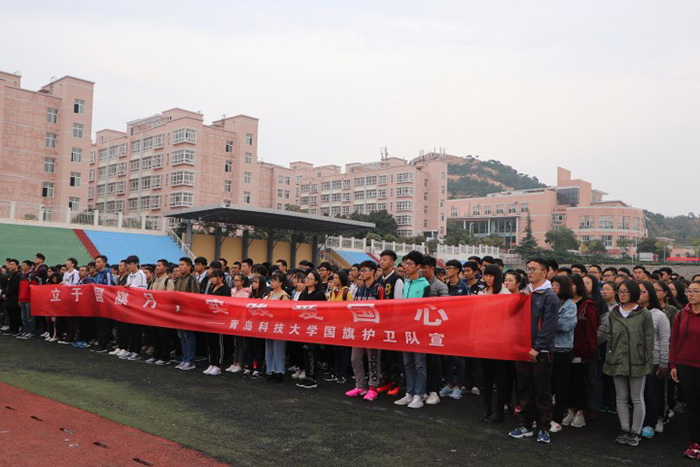 为迎接中共十九大顺利召开,激发广大青年学生的爱校、爱党、爱国情怀,10月16日上午7:00,青岛科技大学崂山校区大一、大二学生共同在崂山田径场举行升国旗仪式。