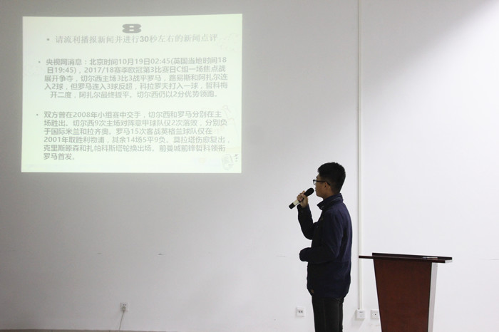 本次比赛包括自我介绍及才艺展示、现场选答和评委点评三个环节。在主持人刘宝忠精彩的开场白下,比赛正式拉开序幕,选手们闪亮登场,他们用自己独特的方式进行自我介绍,各个多才多艺,发挥特长向评委们展现自信的自己。接着,由选手在非凡逻辑、口才考验、情景设置和即兴播报四个类型中根据特长及意愿自行选择并应答,选手们灵活多变,良好的语言表达基础和临场应变能力充分展示出了他们扎实的主持功底。最后,由广播站优秀播音员田依林对选手的表现做了综合评价,充分肯定了部分选手良好的语言表达能力和临场应变能力,表达了对选手们决赛表现的期待并对此次活动的主办方表示了感谢。至此,米乐mile官方网站第四届主持人大赛初赛在观众们热烈的掌声中圆满落下帷幕。