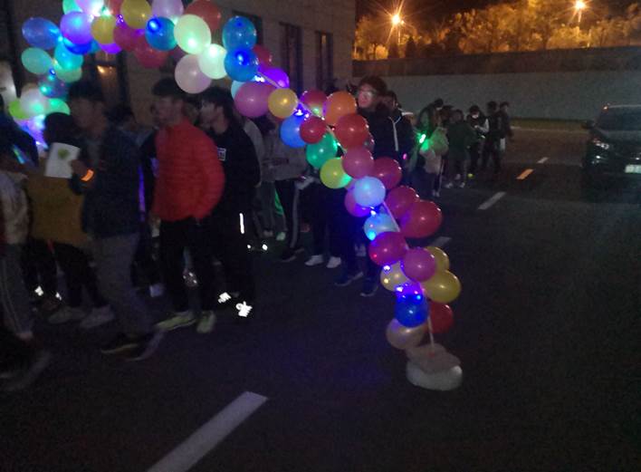 20:00点整,热情的快闪舞蹈拉开了荧光夜跑的序幕,随着荧光亮起,米乐官网分团委李东阳老师、孙坤岩老师慷慨激昂的讲话点燃了同学们的热情,李东阳老师倡导要在实践中体会“地球一小时”的深刻内涵,作为科大学子我们应牢记社会使命,不忘初心,砥砺前行。之后,随着夜跑指令的发出,100多位参与者一起出发,他们头